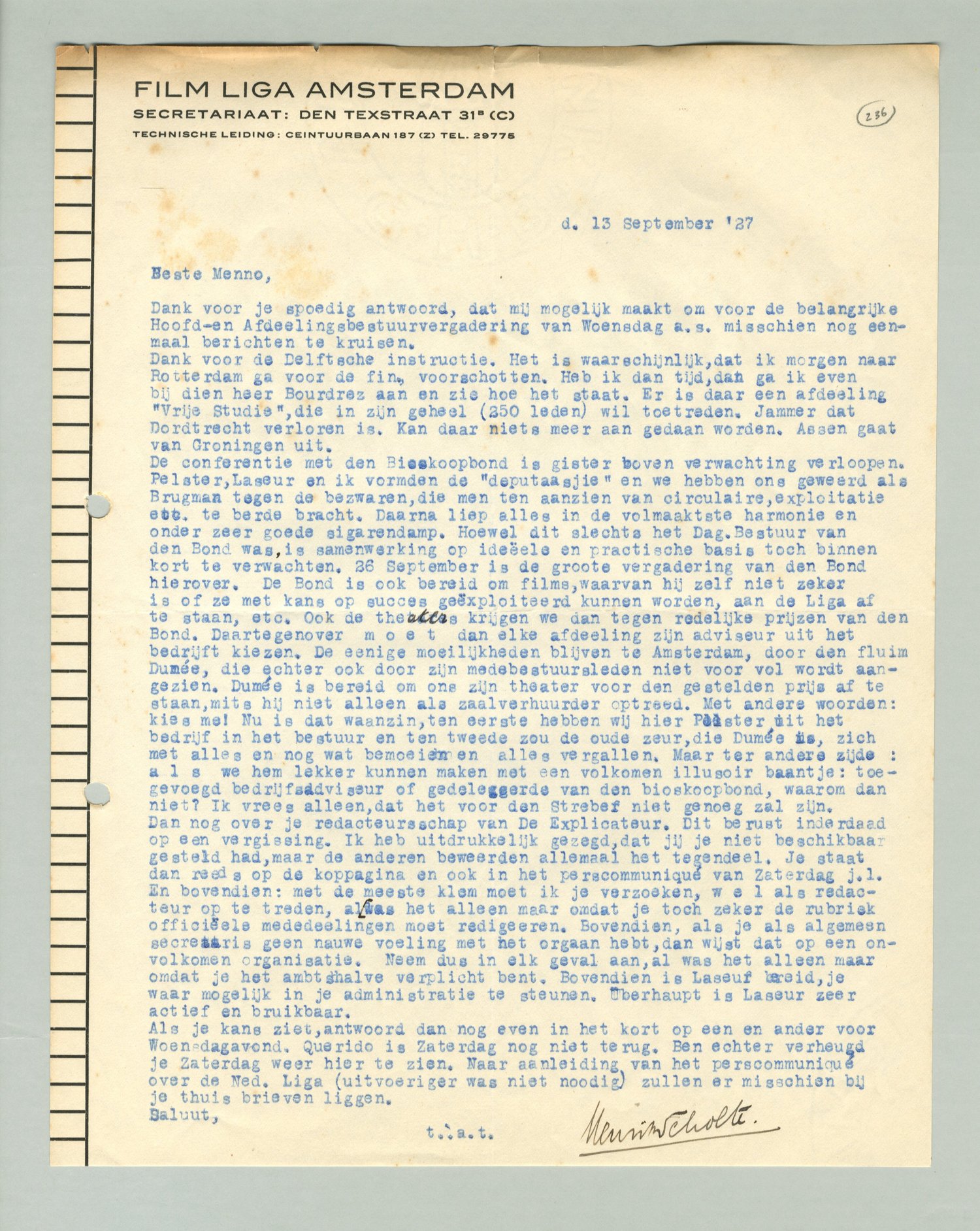 De conferentie met den Bioskoopbond is gister boven verwachting verloopen. Pelster, Laseur en ik vormden de ‘deputaasjie’ en we hebben ons geweerd als Brugman tegen de bezwaren, die men ten aanzien van circulaire, exploitatie etc. te berde bracht. Daarna liep alles in de volmaaktste harmonie en onder zeer goede sigarendamp. Hoewel dit slechts het Dag. Bestuur van den Bond was, is samenwerking op ideëele en practische basis toch binnen kort te verwachten. 26 September is de groote vergadering van den Bond hierover. De Bond is ook bereid om films, waarvan hij zelf niet zeker is of ze met kans op succes geëxploiteerd kunnen worden, aan de Liga af te staan, etc. Ook de theaters krijgen we dan tegen redelijke prijzen van den Bond. Daartegenover moet dan elke afdeeling zijn adviseur uit het bedrijf kiezen. De eenige moeilijkheden blijven te Amsterdam, door den fluim Dumée, die echter ook door zijn medebestuursleden niet voor vol wordt aangezien. Dumée is bereid om ons zijn theater voor den gestelden prijs af te staan, mits hij niet alleen als zaalverhuurder optreed. Met andere woorden: kies me! Nu is dat waanzin, ten eerste hebben wij hier Pelster uit het bedrijf in het bestuur en ten tweede zou de oude zeur, die Dumée is, zich met alles en nog wat bemoeien en alles vergallen. Maar ter andere zijde: als we hem lekker kunnen maken met een volkomen illusoir baantje, waarom dan niet? Ik vrees alleen, dat het voor den Streber niet genoeg zal zijn.