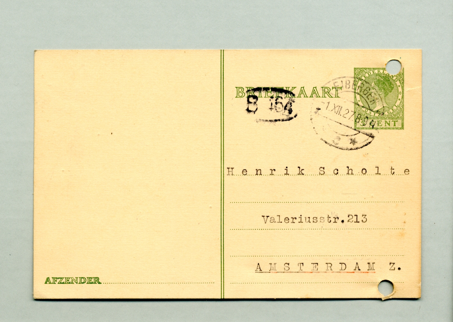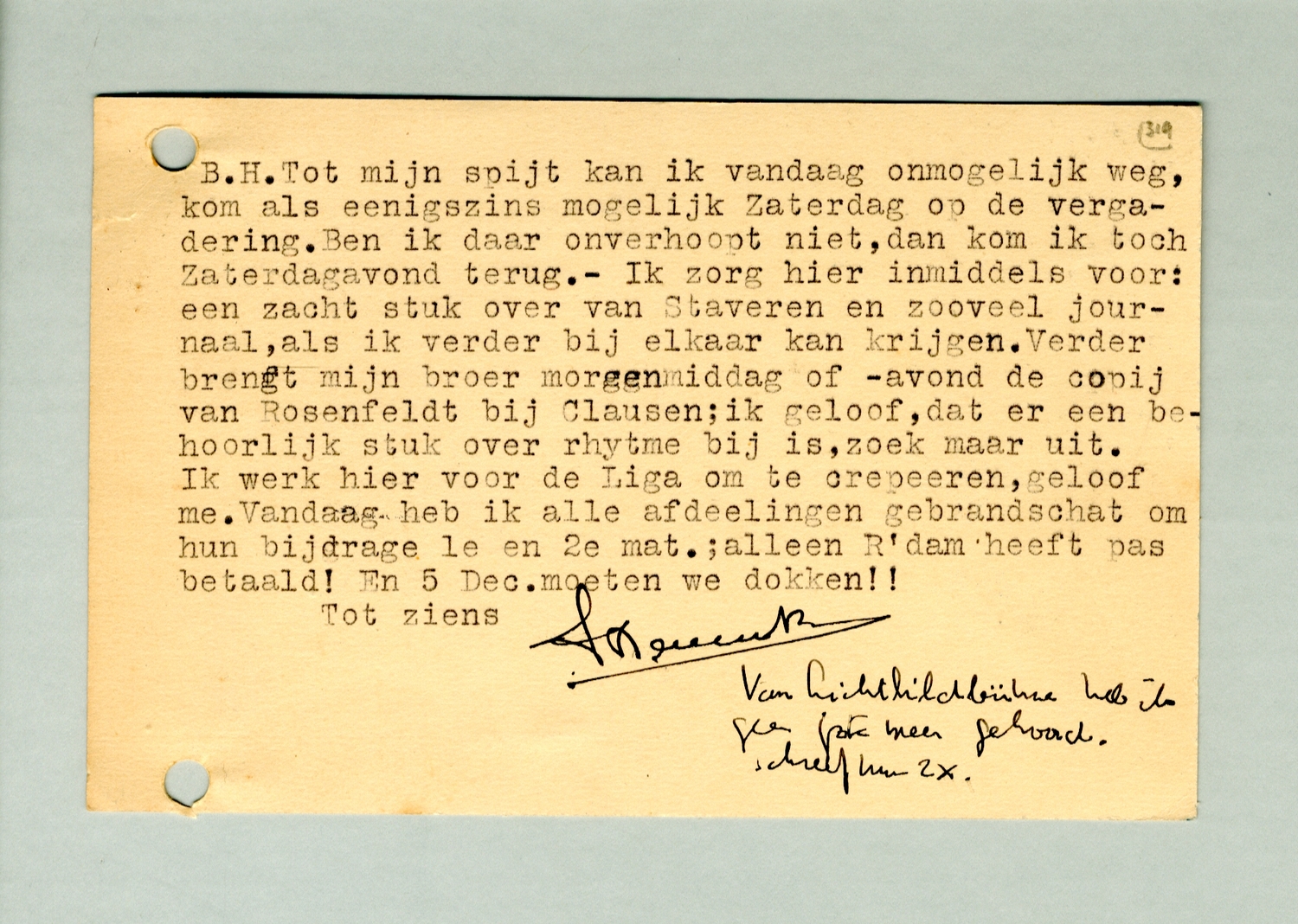 Tot mijn spijt kan ik vandaag onmogelijk weg, kom als eenigszins mogelijk Zaterdag op de vergadering. Ben ik daar onverhoopt niet, dan kom ik toch Zaterdagavond terug. - Ik zorg hier inmiddels voor: een zacht stuk over van Staveren en zooveel journaal, als ik verder bij elkaar kan krijgen. Verder brengt mijn broer morgenmiddag of -avond de copy van Rosenfeldt bij Clausen; ik geloof, dat er een behoorlijk stuk over rhytme bij is, zoek maar uit. Ik werk hier voor de Liga om te crepeeren, geloof me. Vandaag heb ik alle afdeelingen gebrandschat om hun bijdrage 1e en 2e mat.; alleen R'dam heeft pas betaald! En 5 Dec. moeten we dokken!!