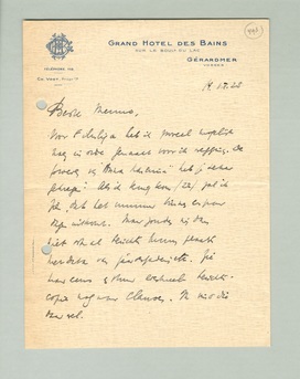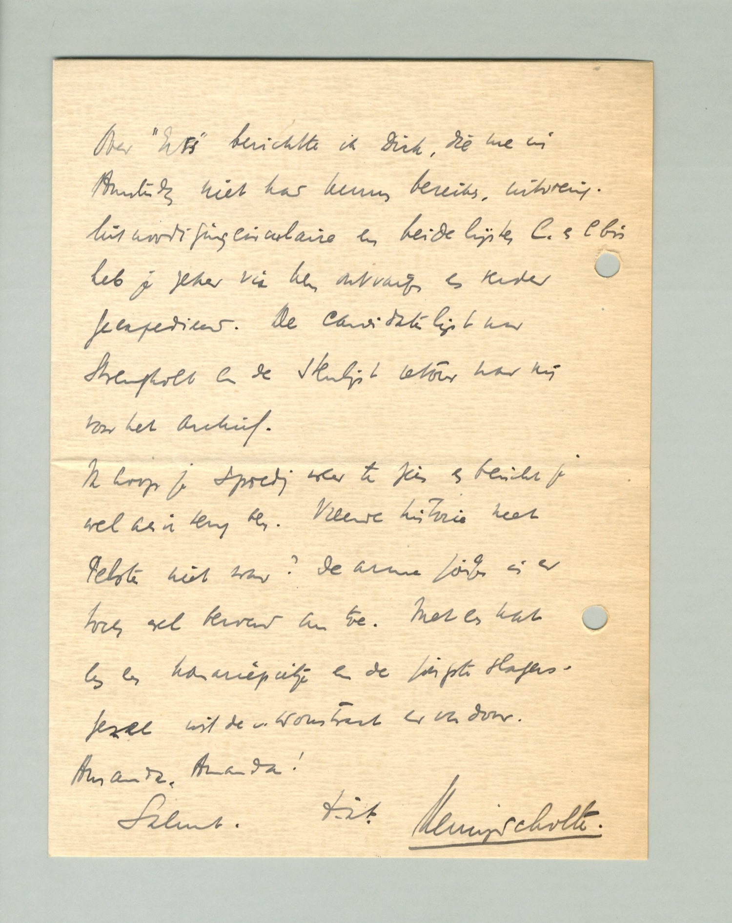 Ik hoop je spoedig weer te zien en bericht je wel als ik terug ben. Vreemde historie met Pelster niet waar? De arme jongen is er toch wel [onleesbaar] aan toe. Met [en] kat [onleesbaar] en kanariepietje en de jongste slagersgezel uit de v. Woustraat er vandoor. [onleesbaar]!