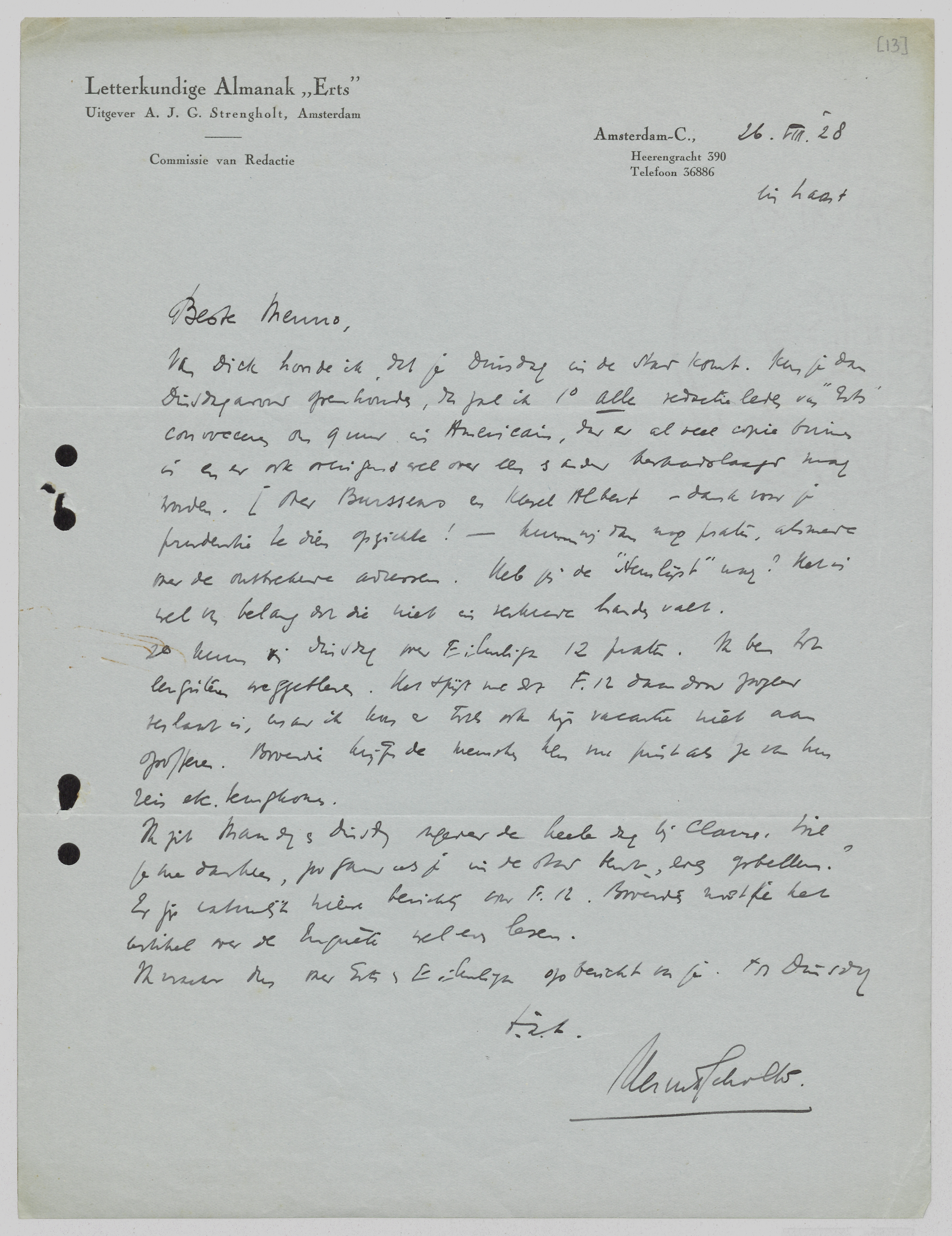 Van Dick hoorde ik, dat je Dinsdag in de stad komt. Kun je dan Dinsdagavond open houden, dan zal ik 1o alle redactieleden van ‘Erts’ convoceeren om 9 uur in Americain, daar er al veel copie binnen is en er ook overigens wel over een en ander beraadslaagd mag worden. Over Burssens en Karel Albert - dank voor je prudentie te dien opzichte! - kunnen wij dan nog praten, alsmede over de ontbrekende adressen. Heb jij de ‘Stemlijst’ nog? Het is wel van belang dat die niet in verkeerde handen valt.