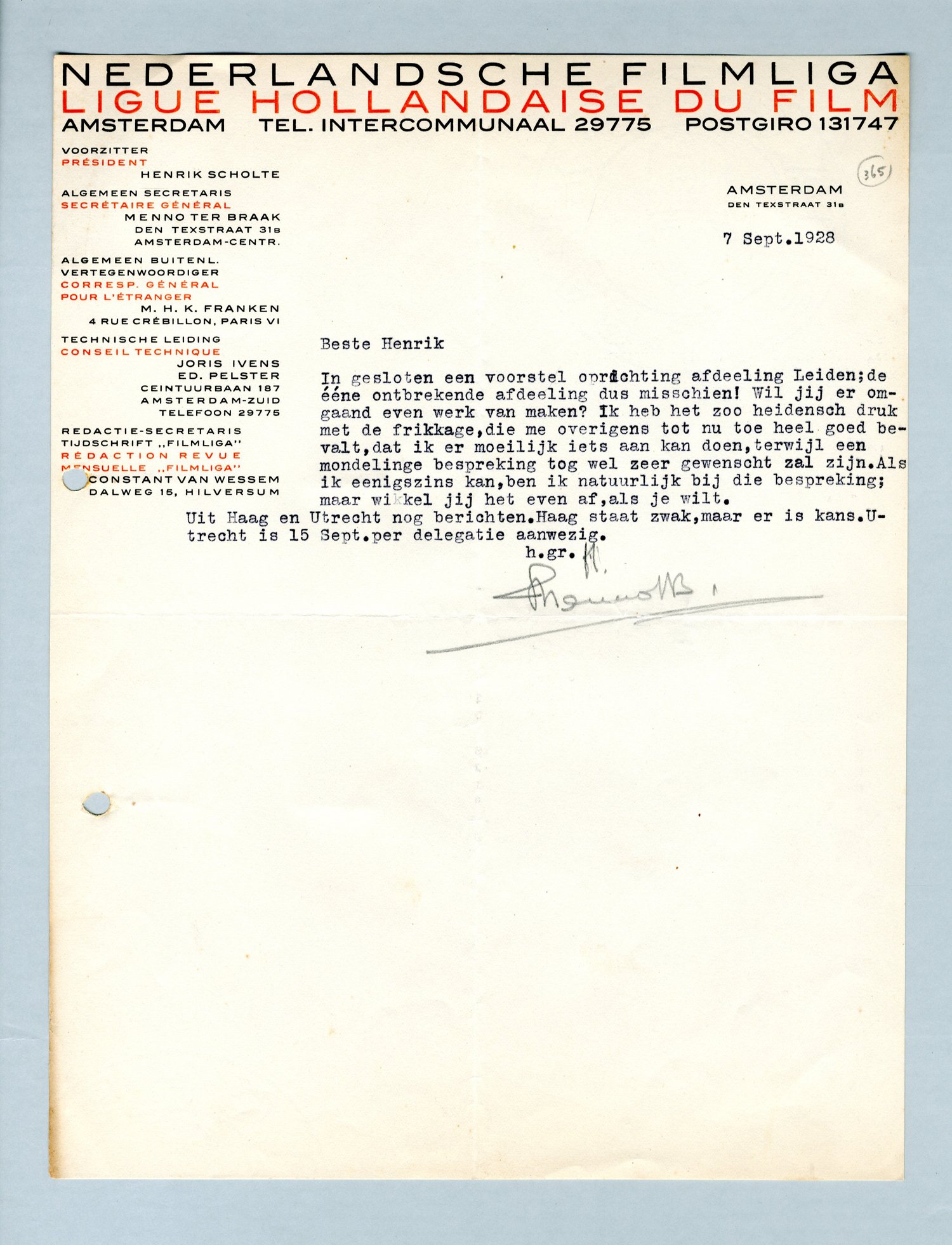 In gesloten een voorstel oprichting afdeeling Leiden; de ééne ontbrekende afdeeling dus misschien! Wil jij er omgaand even werk van maken? Ik heb het zoo heidensch druk met de frikkage, die me overigens tot nu toe heel goed bevalt, dat ik er moeilijk iets aan kan doen, terwijl een mondelinge bespreking tog wel zeer gewenscht zal zijn. Als ik eenigszins kan, ben ik natuurlijk bij die bespreking; maar wikkel jij het even af, als je wilt.