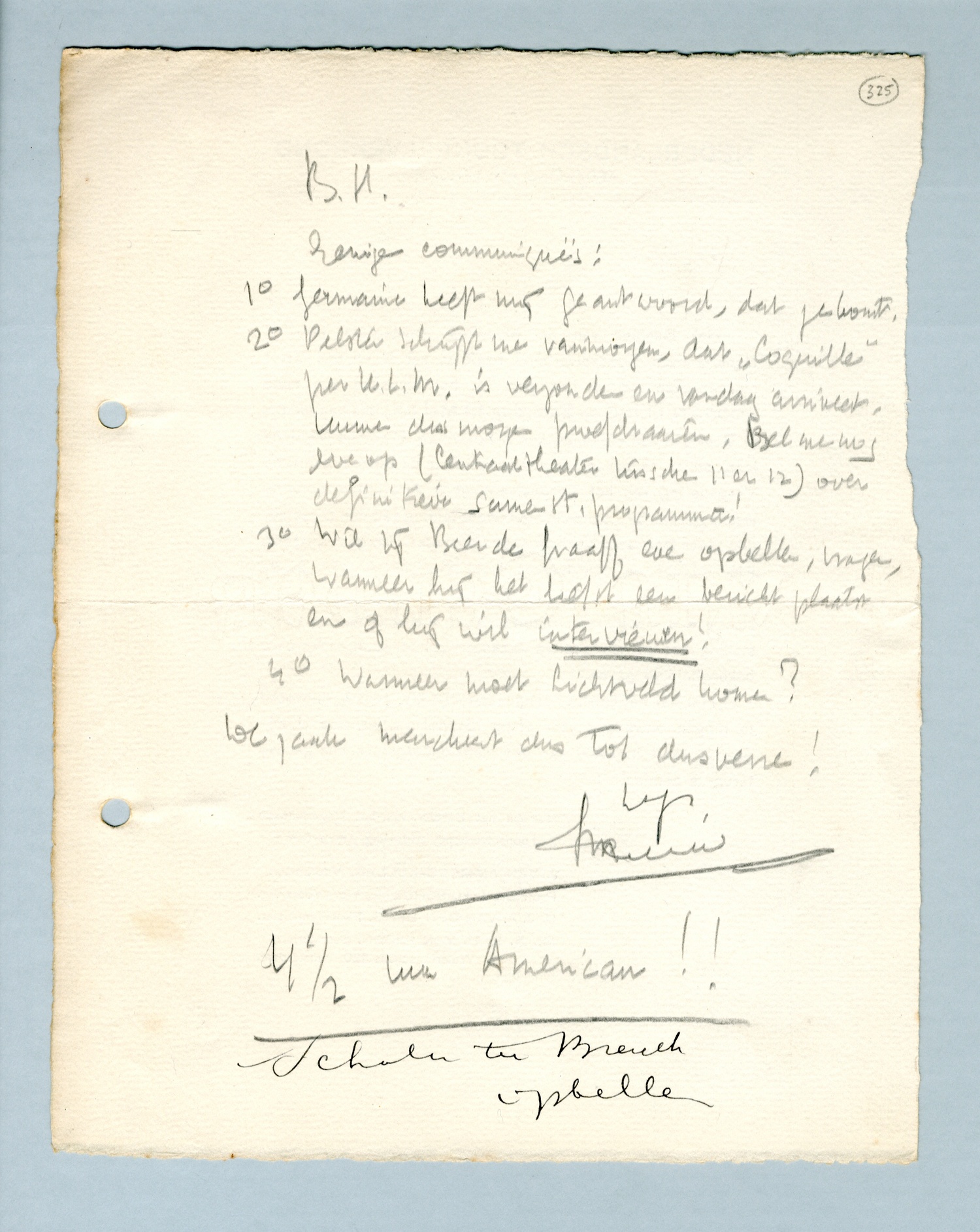 | 2. | Pelster schrijft me vanmorgen, dat Coquille per K.L.M. is verzonden en vandaag arriveert. Kunnen dus morgen proefdraaien. Bel me nog even op (Centraal Theater tusschen 11 en 12) over definitieve samenst. programma! |