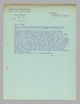 Je essay-slachtoffers zul je voor een deel wel persoonlyk, andersdeels met korte, vrywel gelykluidende brieven kunnen bewerken. Omschryf echter in elken brief precies wat je van den inzender het beste dunkt, eventueel met verwyzing naar een reeds verschenen essay, of eventueel ook dat essay zelf. Kan ik er echter op rekenen dat dat een van de eerstvolgende dagen gebeurt. Jouw werk valt in je vacantietyd, het mijne daarna. Eind Aug. zullen we by elkaar komen om over uitvoering, honoraria etc. te spreken. Wil je met de stemlyst misschien ook de lyst der reeds uitgenoodigde personen terugzenden, daar ik er geen copie meer van heb? Als je van sommige personen het juiste adres niet mocht weten, stuur de enveloppen dan met naam beschreven naar Strengholt, die ze expedieert. Denk je voorts ook eens over je inleidend artikel, dat Strengholt begrypelykerwyze graag vroeg had? Een voorloopig prospectus is reeds in zee, een reis-exemplaar (met Bloems verzen) gaat komende week.