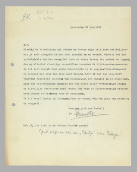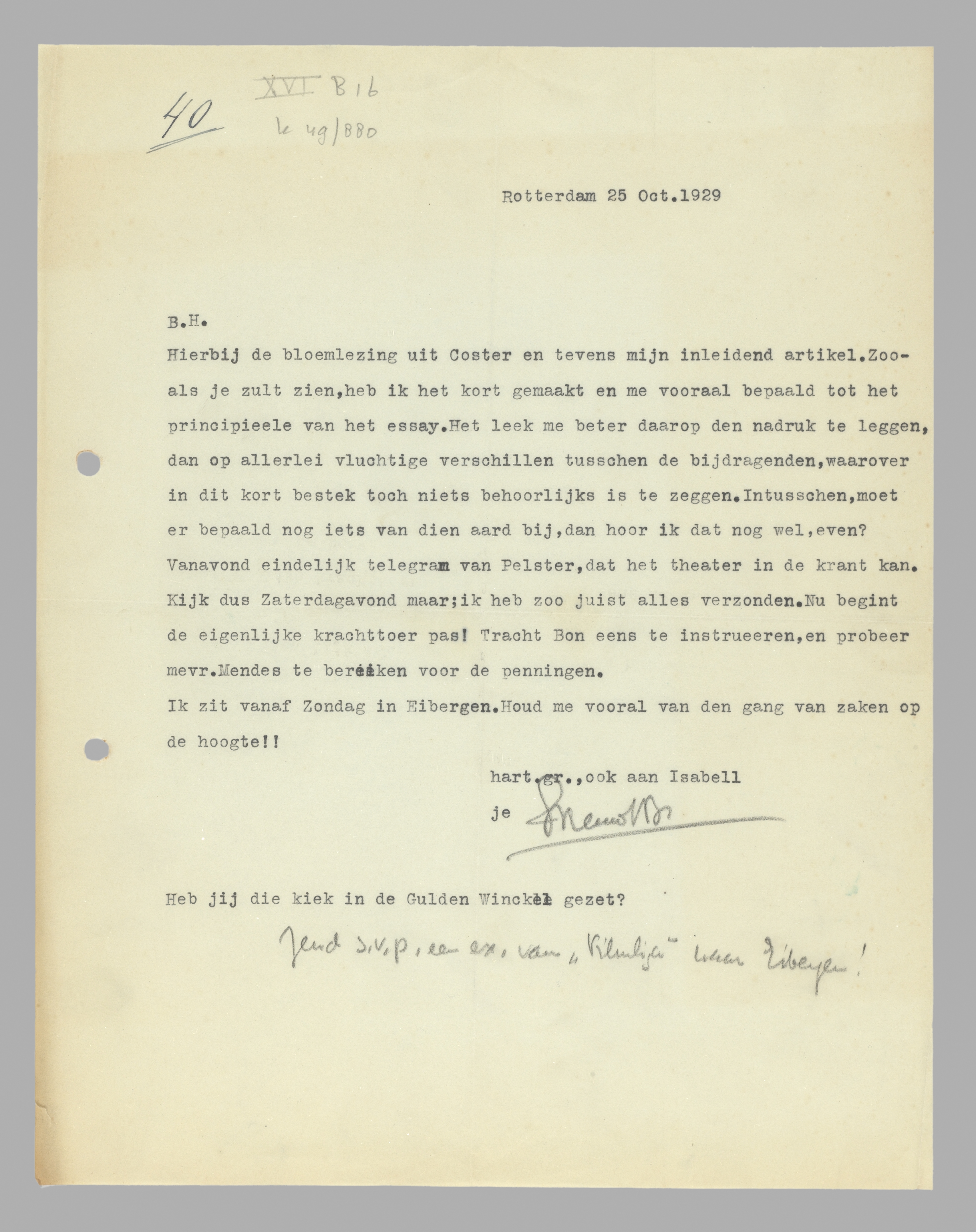 Vanavond eindelijk telegram van Pelster, dat het theater in de krant kan. Kijk dus Zaterdagavond maar; ik heb zoo juist alles verzonden. Nu begint de eigenlijke krachttoer pas! Tracht Bon eens te instrueeren, en probeer mevr. Mendes te bereiken voor de penningen.