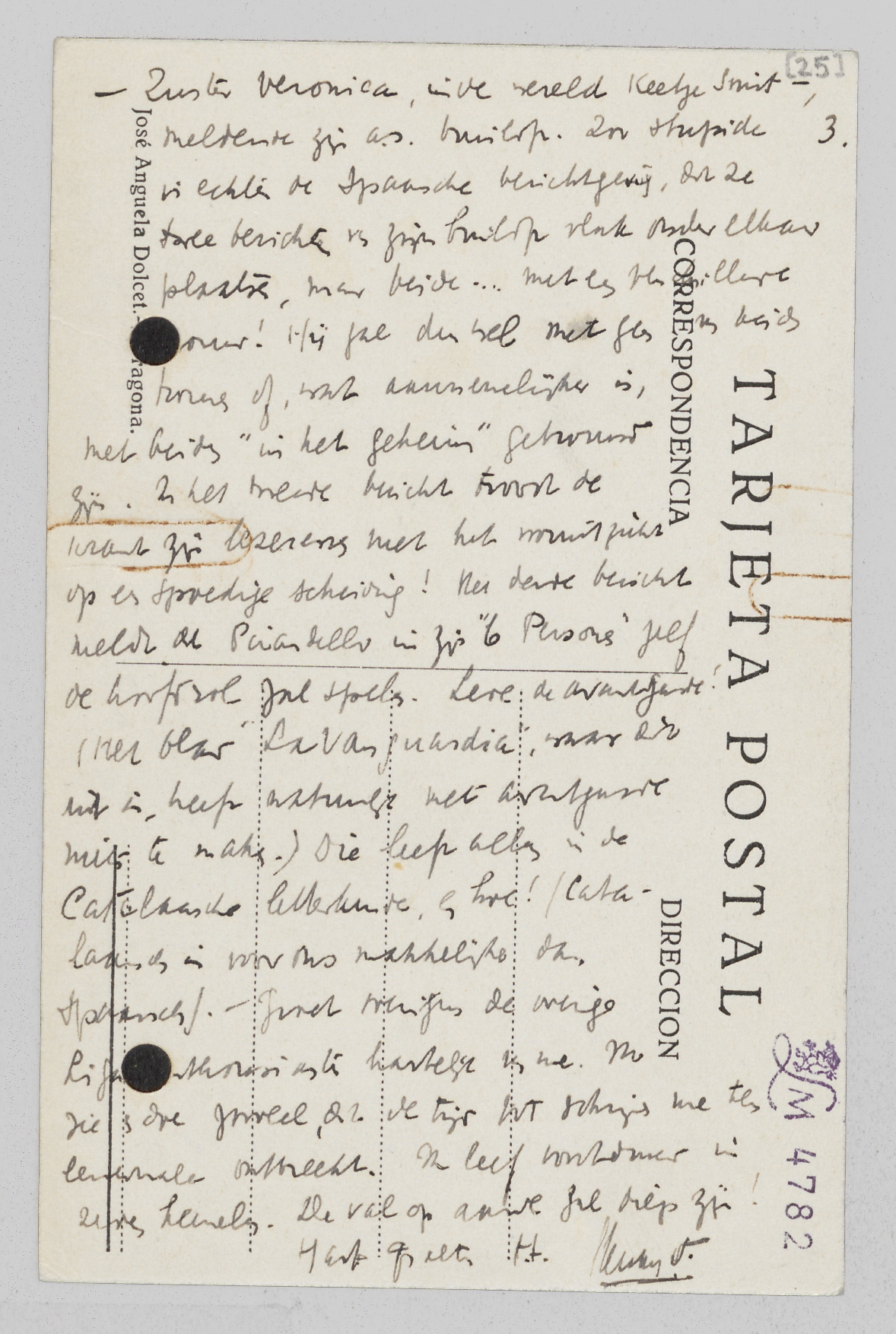 3. - Zuster Veronica, in de wereld Keetje Smit -, meldende zijn a.s. bruiloft. Zoo stupide is echter de Spaansche berichtgeving, dat ze twee berichten van zijn bruiloft vlak onder elkaar plaatsen, maar beide...met een verschillende vrouw! Hij zal dus wel met geen van beide trouwen of, wat aannemelijker is, met beiden ‘in het geheim’ getrouwd zijn. In het tweede bericht troost de krant zijn lezeressen met het vooruitzicht op een spoedige scheiding! Het derde bericht meldt dat Pirandello in zijn ‘6 Persons’ zelf de hoofdrol zal spelen. Leve de avantgarde! (Het blad ‘Lavanguardia’, waar dit uit is, heeft natuurlijk met avantgarde niets te maken.) Die leeft alleen in de Catalaansche letterkunde, en hoe! (Catalaansch is voor ons makkelijker dan Spaansch). - Groet overigens de overige Liga[-en]thousiasten hartelijk van me. Ik zie en doe zooveel, dat de tijd tot schrijven me ten eenenmale ontbreekt. Ik leef voortdurend in zeven hemelen. De val op aarde zal diep zijn!