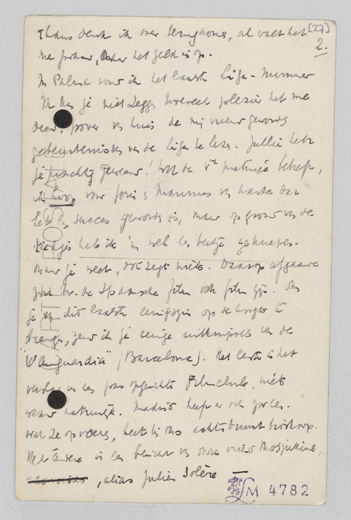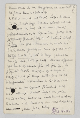 In Palma vond ik het laatste Liga-nummer. Ik kan je niet zeggen hoeveel plezier het me deed, zoover van huis de mij nieuw gevonden gebeurtenissen van de Liga te lezen. Jullie hebt je prachtig [gestemd]! Wat de Ve matinée betreft, ik hoop voor Joris en Mannus van harte dat het een succes geworden is, maar op grond van de kiekjes heb ik 'm wel een beetje geknepen. Maar je weet, dat zegt niets. Daarop afgaande zou bv. de Spaansche film ook film zijn. Om je van dit laatste eenigszins op de hoogte te brengen, zend ik je eenige uitknipsels van de ‘Vanguardia’ (Barcelona). Het eerste is het verslag van een pas opgerichte Filmclub, niet waar natuurlijk. Madrid heeft er nl. zoo een. Wat ze opvoeren, heet bij ons achterbuurt bioskoop. Het andere is een bericht van onze vriend Mosjukine, alias Julien Solère