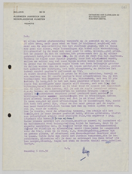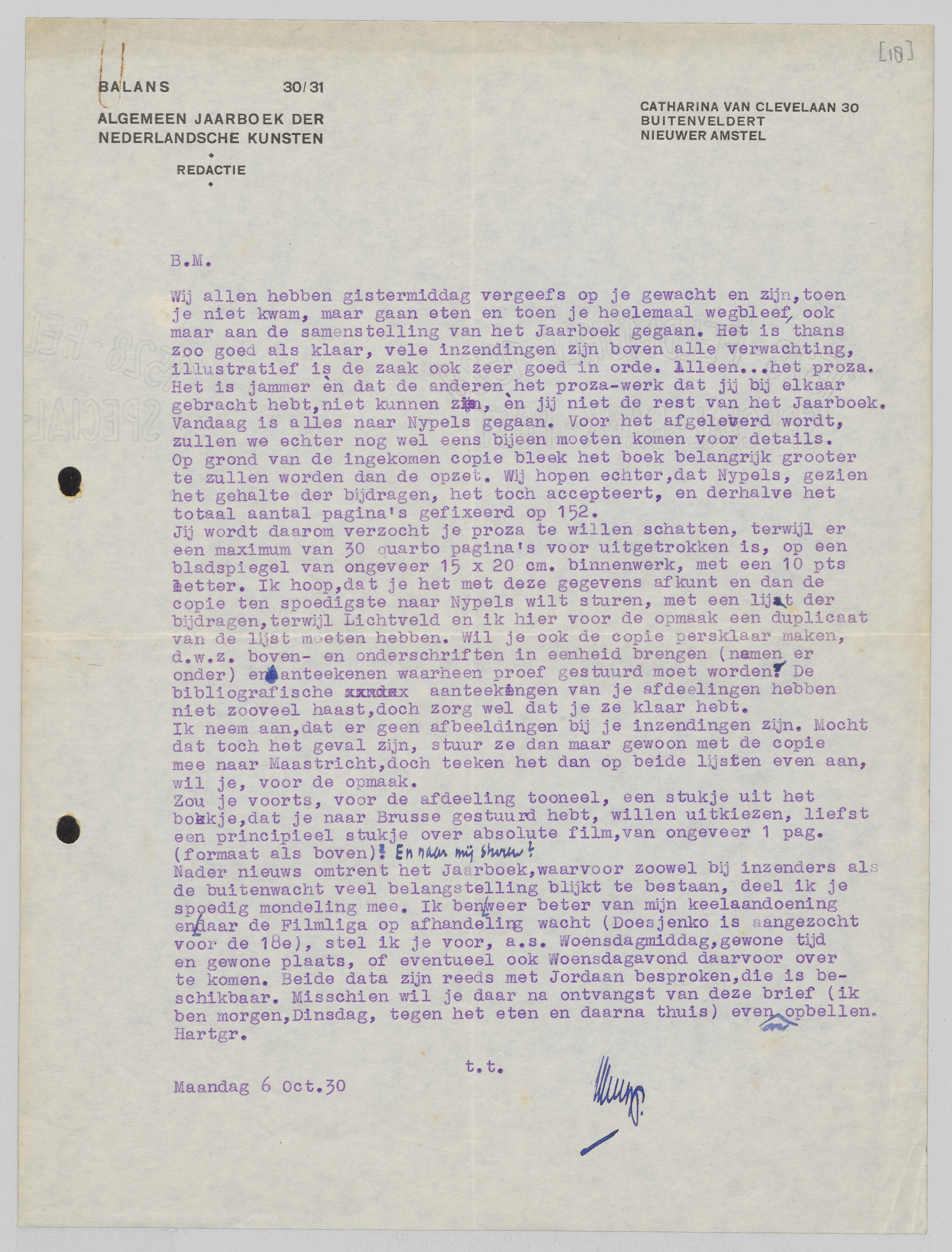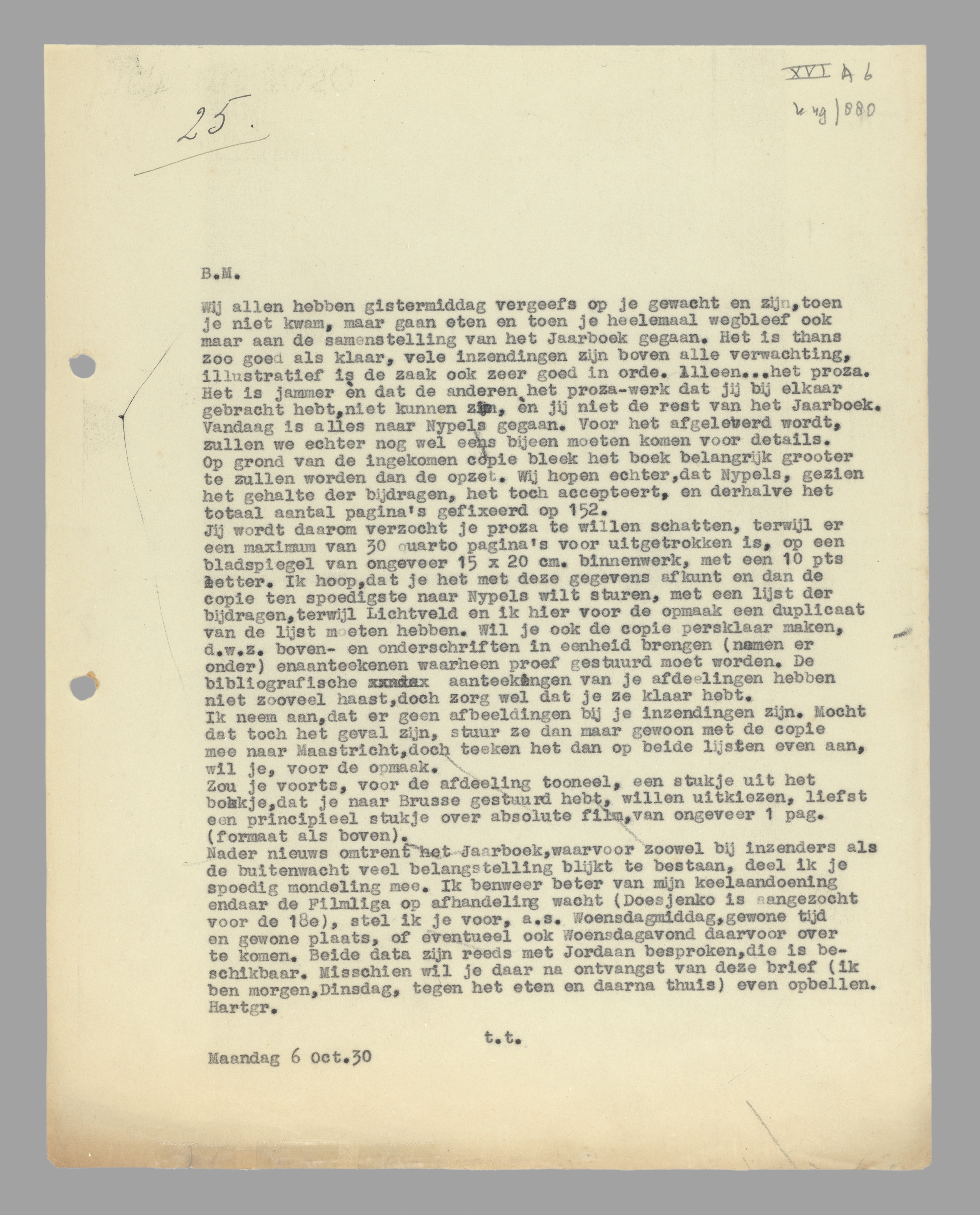 Nader nieuws omtrent het Jaarboek, waarvoor zoowel bij inzenders als de buitenwacht veel belangstelling blijkt te bestaan, deel ik je spoedig mondeling mee. Ik ben weer beter van mijn keelaandoening en daar de Filmliga op afhandeling wacht (Doesjenko is aangezocht voor de 18e), stel ik je voor, a.s. Woensdagmiddag, gewone tijd en gewone plaats, of eventueel ook Woensdagavond daarvoor over te komen. Beide data zijn reeds met Jordaan besproken, die is beschikbaar. Misschien wil je daar na ontvangst van deze brief (ik ben morgen, Dinsdag, tegen het eten en daarna thuis) even (over) opbellen.