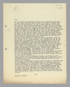 Jij wordt daarom verzocht je proza te willen schatten, terwijl er een maximum van 30 quarto pagina's voor uitgetrokken is, op een bladspiegel van ongeveer 15 x 20 cm. binnenwerk, met een 10 pts letter. Ik hoop, dat je het met deze gegevens afkunt en dan de copie ten spoedigste naar Nypels wilt sturen, met een lijst der bijdragen, terwijl Lichtveld en ik hier voor de opmaak een duplicaat van de lijst moeten hebben. Wil je ook de copie persklaar maken, d.w.z. boven- en onderschriften in eenheid brengen (namen er onder) en aanteekenen waarheen proef gestuurd moet worden. De bibliografische aanteekeningen van je afdeelingen hebben niet zooveel haast, doch zorg wel dat je ze klaar hebt.