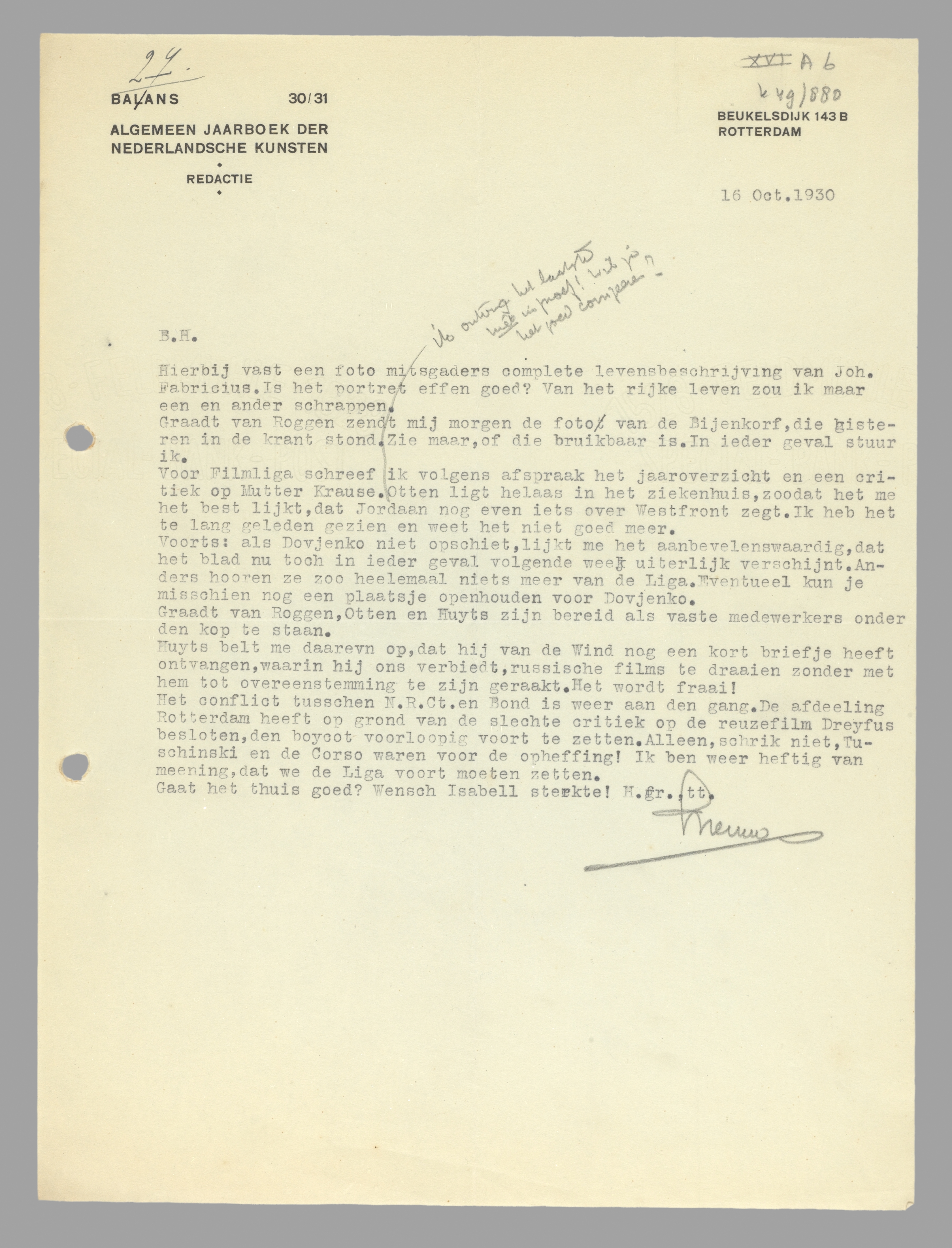Voor Filmliga schreef ik volgens afspraak het jaaroverzicht en een critiek op Mutter Krause (Ik ontving het laatste ‘niet’ in proef! Wil je het goed corrigeeren?). Otten ligt helaas in het ziekenhuis, zoodat het me het best lijkt, dat Jordaan nog even iets over Westfront zegt. Ik heb het te lang geleden gezien en weet het niet goed meer.