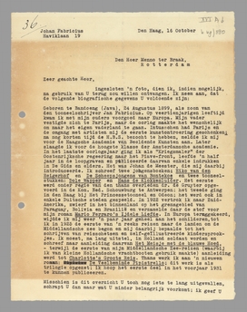 Geboren te Bandoeng (Java), 24 Augustus 1899, als zoon van den tooneelschrijver Jan Fabricius. Op veertienjarigen leeftijd kwam ik met mijn ouders voorgoed naar Europa. Mijn vader verstigde zich te Parijs, maar de oorlog maakte het wenschelijk om naar het eigen vaderland te gaan. Intusschen had Parijs en de omgang met artisten mij de eerste kunstontroering geschonken; na nog korten tijd de H.B.S. bezocht te hebben, meldde ik mij voor de Haagsche Avademie van Beeldende Kunsten aan. Later slaagde ik voor de hoogste klasse der Amsterdamsche academie. In het laatste oorlogsjaar ging ik als “Kriegsmaler” der Oostenrijksche regeering naar het Piave-front, leefde ’n half jaar in de loopgraven en publiceerde daarvan enkele indrukken in De Gids en elders. Het was Johan de Meester, die mij daarbij introduceerde. Ik schreef twee jongensboeken: Eiko van den Reigerhof en De Scheepsjongens van Bontekoe en twee toneelstukken: Dole Wapper en Hans de Klokkenluider. Het eerste werd onder regie van den thans overleden dr. de Gruyter opgevoerd in de Kon. Ned. Schouwburg te Antwerpen; het tweede ging in den Haag bij Het Princessetooneel en Odeon; het werd ook in enkele Duitsche steden gespeeld. In 1922 vertrok ik naar Zuid-Amerika, zwierf in het binnenland op het grensgebied van Paraguay, Bolivia en Brazilië en verzamelde daar de stof voor mijn roman Mario Ferraro’s Ijdele Liefde. In Europa teruggekeerd, wijdde ik mij weer ’n paar jaar geheel aan het schilderen, tot ik in 1925 de eerste van ’n reeks reizen naar de landen om de Middellandsche zee begon en mij daarbij bepaalde tot het schrijven van reisschetsen en zelf-geïllustreerde kindersprookjes. Ik moest, na lang uitstel, in Holland soldaat worden en schreef naar aanleiding daarvan Het Meisje met de blauwe Hoed, - terwijl de eerste van mijn Middellandsche Zee-reizen (waarbij ik van kleine Hollandsche vrachtbooten gebruik maakte) aanleiding werd tot Charlotte’s Groote Reis. Thans werk ik aan ’n nieuwen roman: De Veelbeminde Pipistrello; dit werk is als trilogie opgezet; ik hoop het eerste deel in het voorjaar 1931 te kunnen publiceeren.