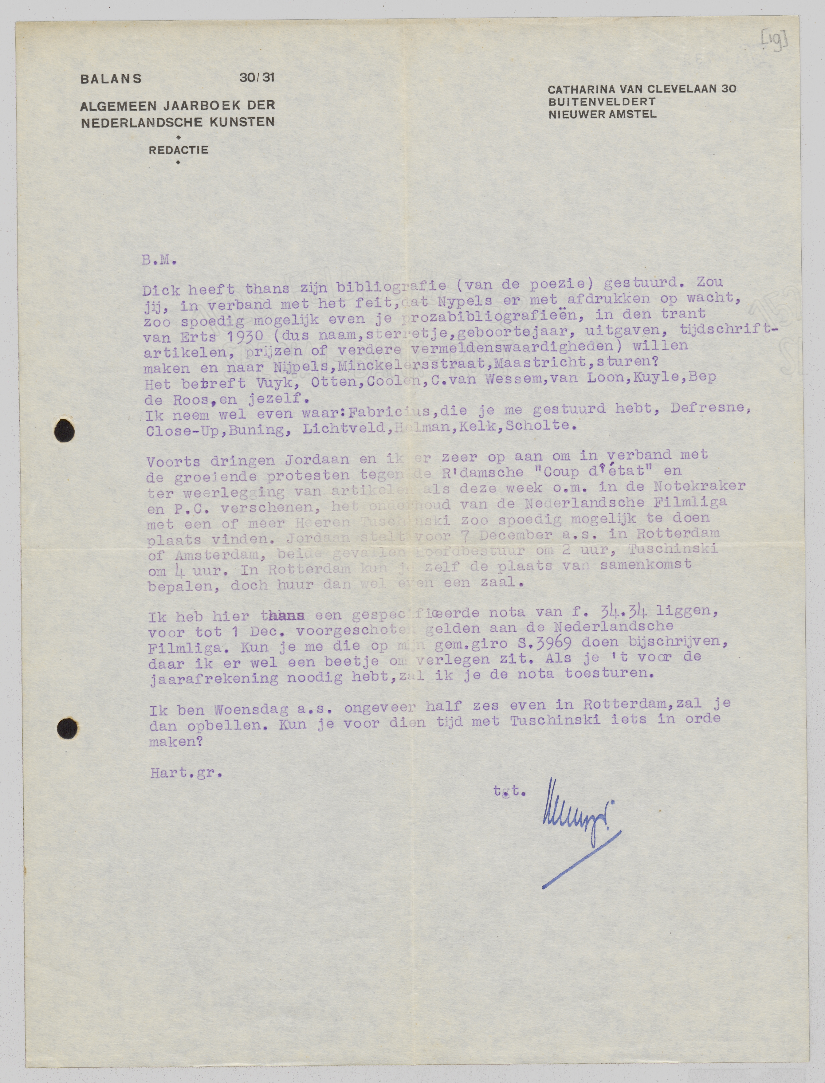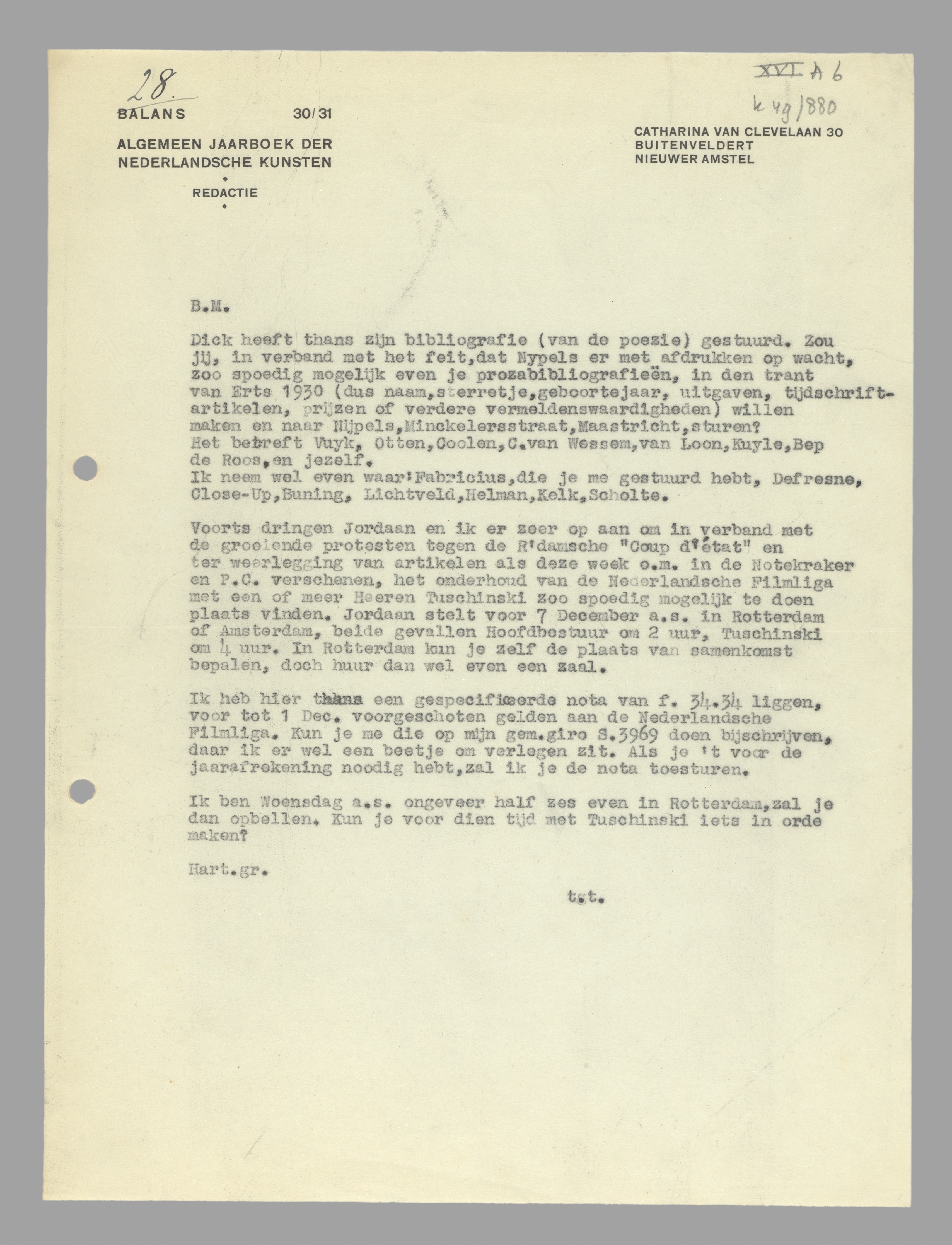 Voorts dringen Jordaan en ik er zeer op aan om in verband met de groeiende protesten tegen de R'damsche ‘Coup d'état’ en ter weerlegging van artikelen als deze week o.m. in de Notekraker en P.C. verschenen, het onderhoud van de Nederlandsche Filmliga met een of meer Heeren Tuschinski zoo spoedig mogelijk te doen plaats vinden. Jordaan stelt voor 7 December a.s. in Rotterdam of Amsterdam, beide gevallen Hoofdbestuur om 2 uur, Tuschinski om 4 uur. In Rotterdam kun je zelf de plaats van samenkomst bepalen, doch huur dan wel even een zaal.