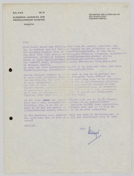 Ik heb hier thans een gespecificeerde nota van f. 34.34 liggen, voor tot 1 Dec. voorgeschoten gelden aan de Nederlandsche Filmliga. Kun je me die op mijn gem. giro S.3969 doen bijschrijven, daar ik er wel een beetje om verlegen zit. Als je 't voor de jaarafrekening noodig hebt, zal ik je de nota toesturen.