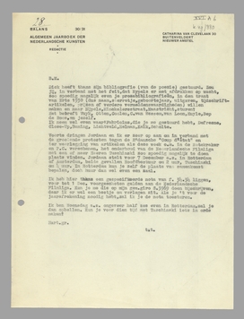 Dick heeft thans zijn bibliografie (van de poezie) gestuurd. Zou jij, in verband met het feit, dat Nypels er met afdrukken op wacht, zoo spoedig mogelijk even je prozabibliografieën, in den trant van Erts 1930 (dus naam, sterretje, geboortejaar, uitgaven, tijdschriftartikelen, prijzen of verdere vermeldenswaardigheden) willen maken en naar Nijpels, Minckelersstraat, Maastricht, sturen? Het betreft Vuyk, Otten, Coolen, C. van Wessem, van Loon, Kuyle, Bep de Roos, en jezelf.