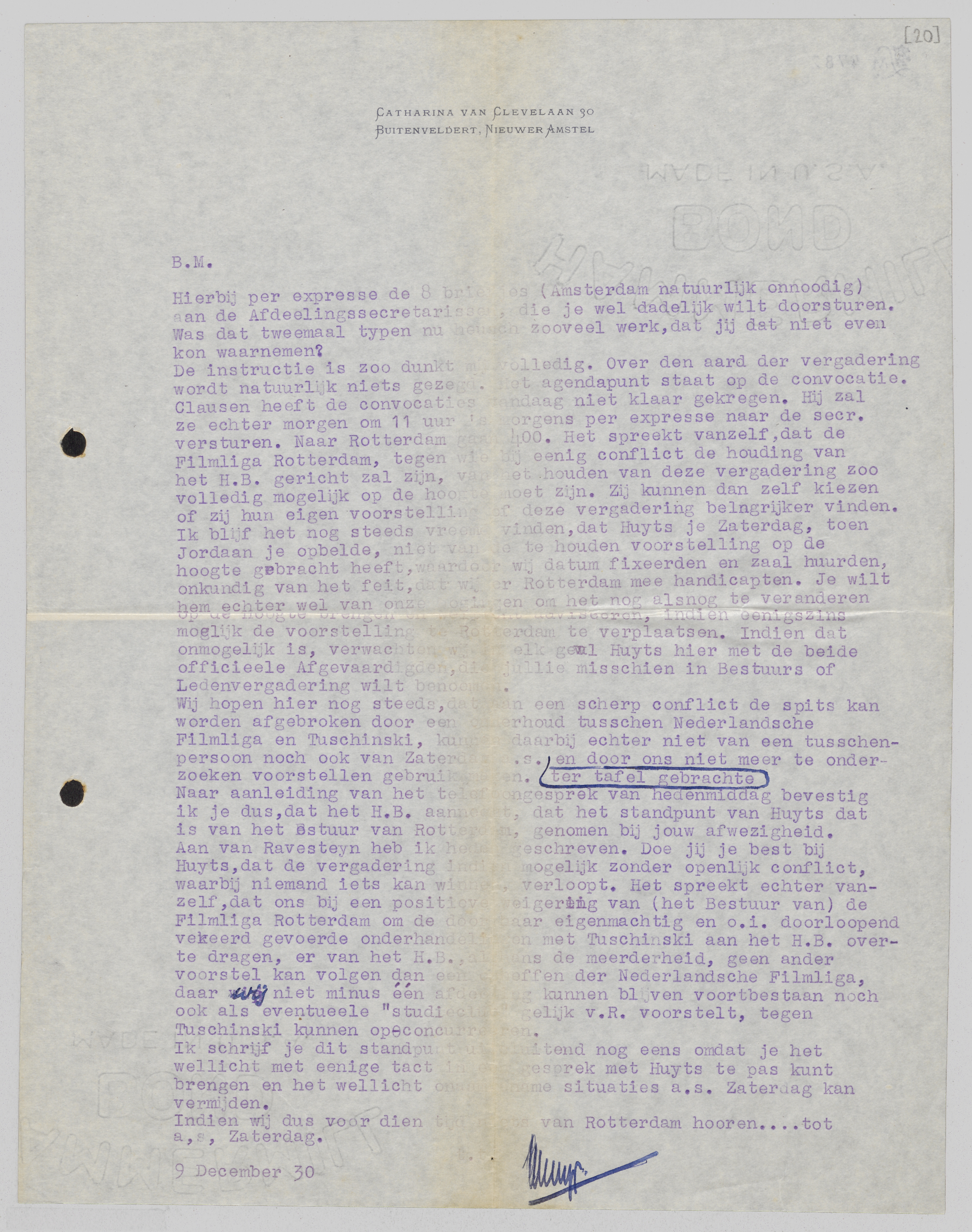 De instructie is zoo dunkt mij volledig. Over den aard der vergadering wordt natuurlijk niets gezegd. Het agendapunt staat op de convocatie. Clausen heeft de convocaties vandaag niet klaar gekregen. Hij zal ze echter morgen om 11 uur 's morgens per expresse naar de secr. versturen. Naar Rotterdam gaan 400. Het spreekt vanzelf, dat de Filmliga Rotterdam, tegen wie bij eenig conflict de houding van het H.B. gericht zal zijn, van het houden van deze vergadering zoo volledig mogelijk op de hoogte moet zijn. Zij kunnen dan zelf kiezen of zij hun eigen voorstelling of deze vergadering belangrijker vinden. Ik blijf het nog steeds vreemd vinden, dat Huyts je Zaterdag, toen Jordaan je opbelde, niet van de te houden voorstelling op de hoogte gebracht heeft, waardoor wij datum fixeerden en zaal huurden, onkundig van het feit, dat wij er Rotterdam mee handicapten. Je wilt hem echter wel van onze pogingen om het alsnog te veranderen op de hoogte brengen en wellicht adviseeren, indien eenigszins mogelijk de voorstelling te Rotterdam te verplaatsen. Indien dat onmogelijk is, verwachten wij in elk geval Huyts hier met de beide officieele Afgevaardigden, die jullie misschien in Bestuurs of Ledenvergadering wilt benoemen.