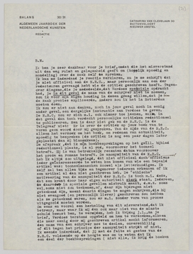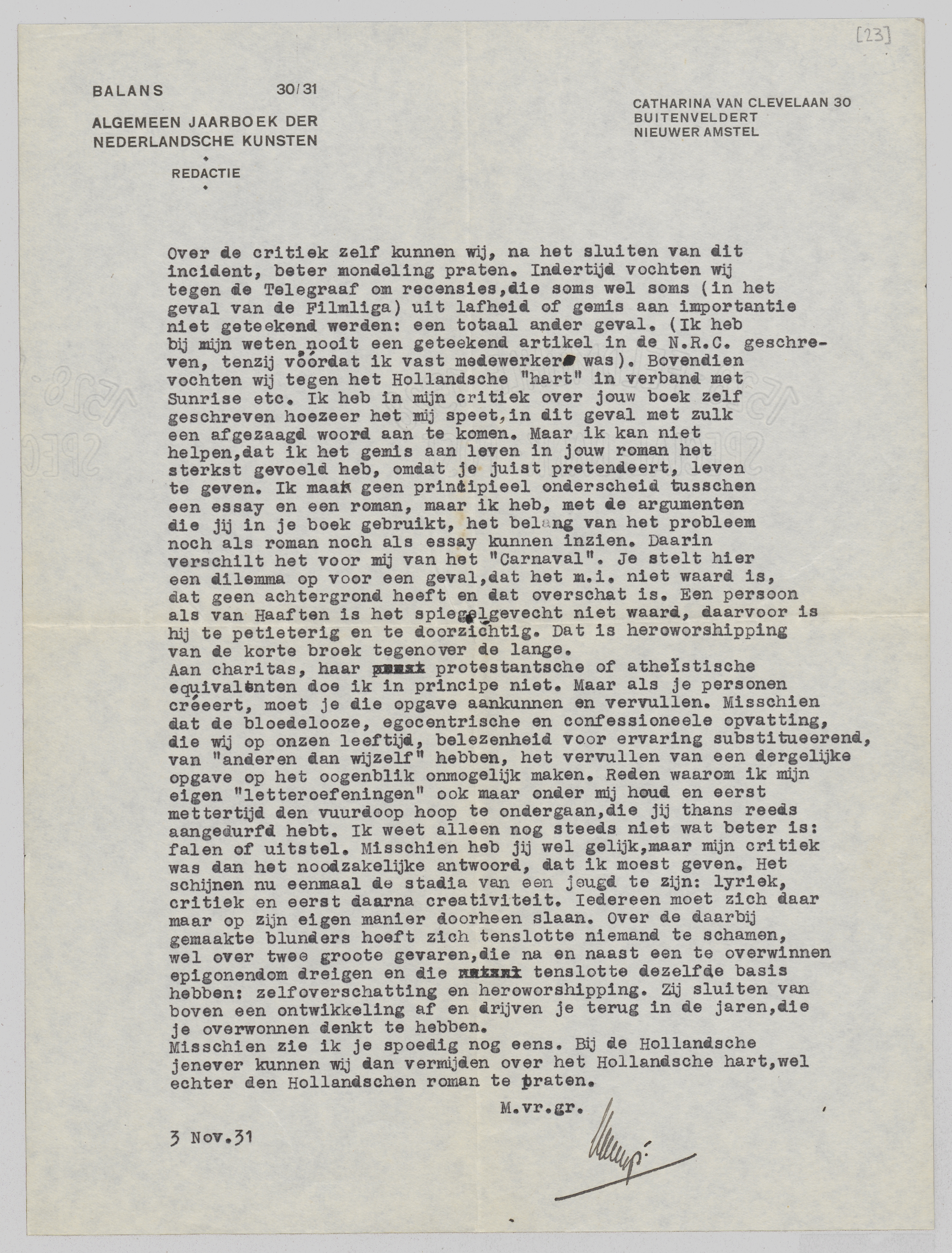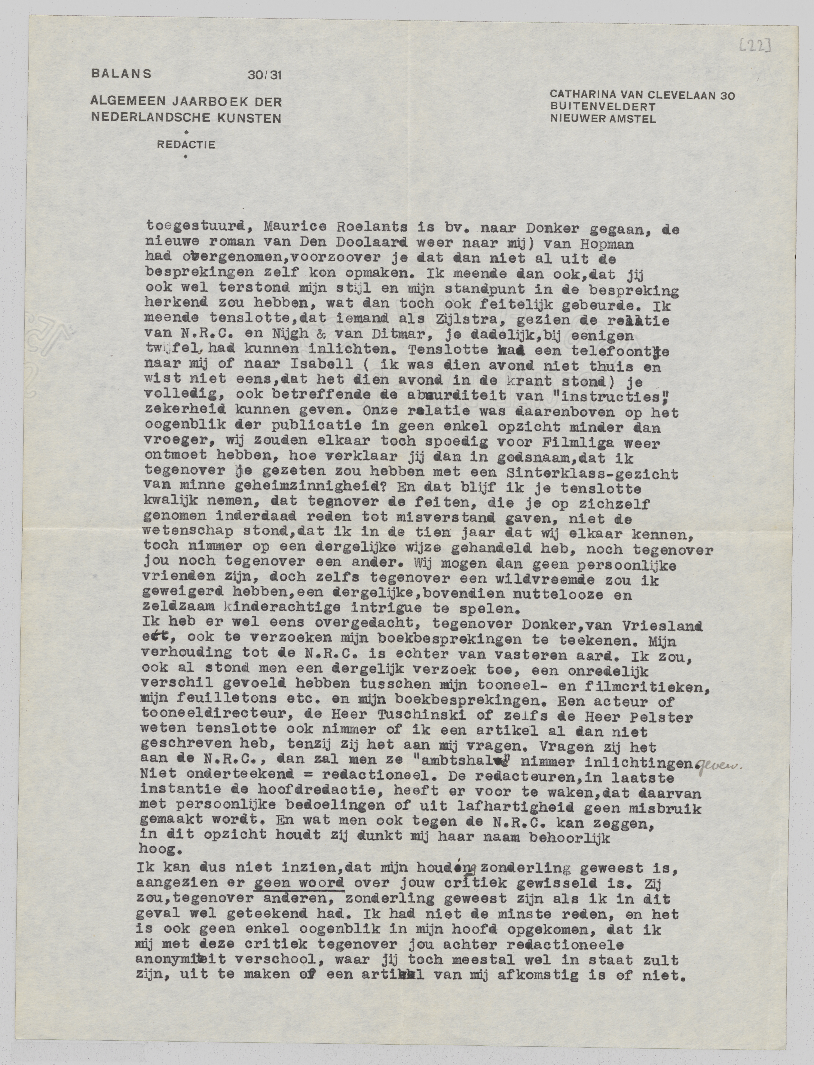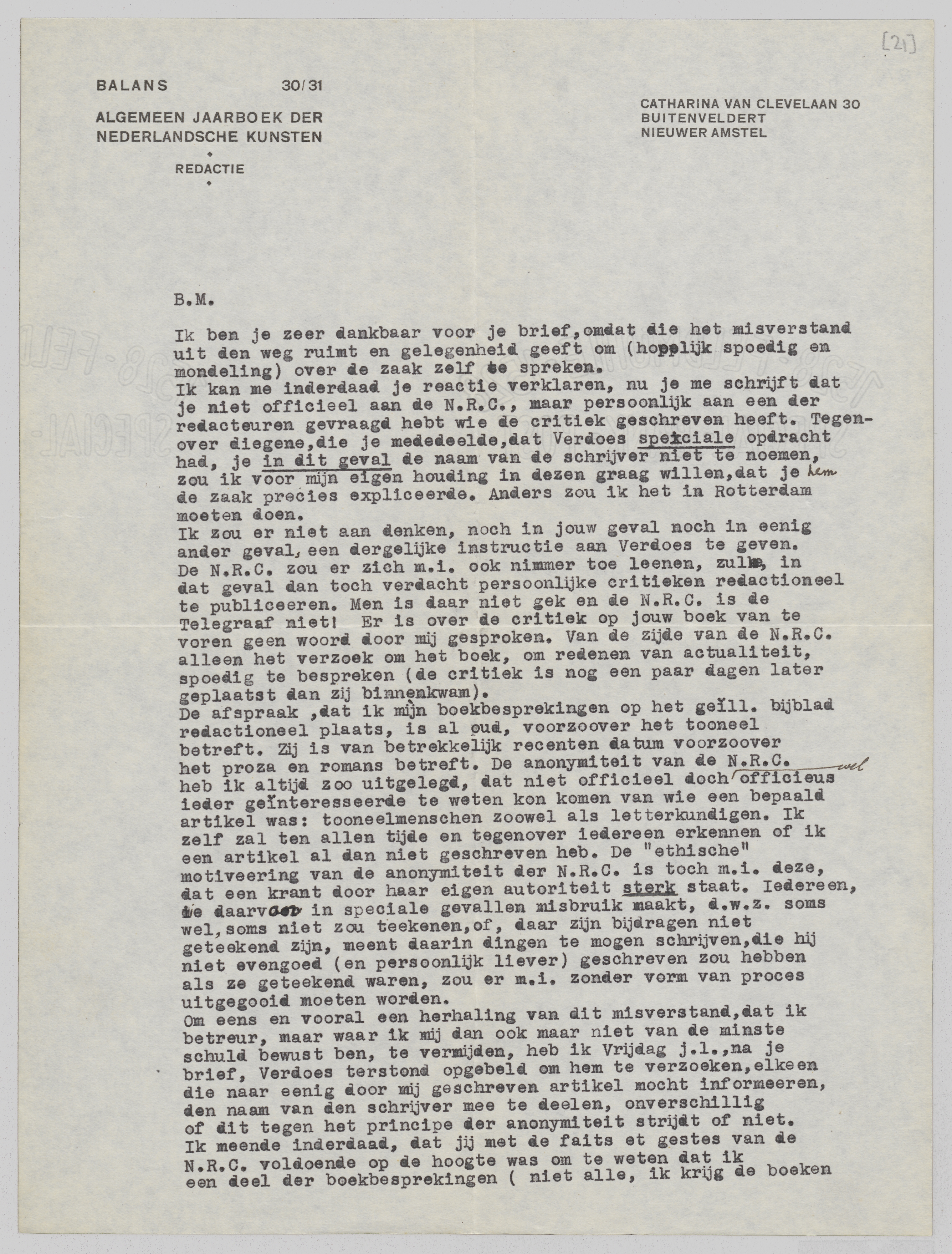 Ik heb er wel eens overgedacht, tegenover Donker, van Vriesland etc., ook te verzoeken mijn boekbesprekingen te teekenen. Mijn verhouding tot de N.R.C. is echter van vasteren aard. Ik zou, ook al stond men een dergelijk verzoek toe, een onredelijk verschil gevoeld hebben tusschen mijn tooneel- en filmcritieken, mijn feuilletons etc. en mijn boekbesprekingen. Een acteur of tooneeldirecteur, de Heer Tuschinski of zelfs de Heer Pelster weten tenslotte ook nimmer of ik een artikel al dan niet geschreven heb, tenzij zij het aan mij vragen. Vragen zij het aan de N.R.C., dan zal men ze ‘ambtshalve’ nimmer inlichtingen (geven). Niet onderteekend = redactioneel. De redacteuren, in laatste instantie de hoofdredactie, heeft er voor te waken, dat daarvan met persoonlijke bedoelingen of uit lafhartigheid geen misbruik gemaakt wordt. En wat men ook tegen de N.R.C. kan zeggen, in dit opzicht houdt zij dunkt mij haar naam behoorlijk hoog.