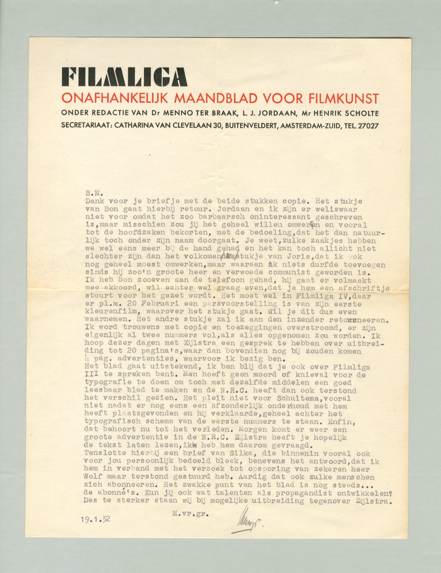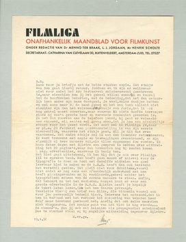 Dank voor je briefje met de beide stukken copie. Het stukje van Bon gaat hierbij retour. Jordaan en ik zijn er weliswaar niet voor omdat het zoo barbaarsch oninteressant geschreven is, maar misschien zou jij het geheel kunnen omwerken en vooral tot de hoofdzaken bekorten, met de bedoeling, dat het dan natuurlijk toch onder zijn naam doorgaat. Je weet, zulke zaakjes hebben we wel eens meer bij de hand gehad en het kan toch allicht niet slechter zijn dan het volkomen onleesbare stukje van Joris, dat ik ook nog geheel moest omwerken, maar waaraan ik niets durfde toevoegen sinds hij zoo'n groote heer en verwoede communist geworden is. Ik heb Bon zooeven aan de telefoon gehad, hij gaat er volmaakt mee akkoord, wil echter wel graag even, dat je hem een afschriftje stuurt voor het gezet wordt. Het moet wel in Filmliga IV, daar er pl.m. 20 Februari een persvoorstelling is van zijn eerste kleurenfilm, waarover het stukje gaat. Wil je dit dus even waarnemen. Het andre stukje zal ik aan den inzender retourneeren. Ik word trouwens met copie en toezeggingen overstroomd, er zijn eigenlijk al twee nummers vol, als alles opgenomen zou worden. Ik hoop dezer dagen met Zijlstra een gesprek te hebben over uitbreiding tot 20 pagina's, waar dan bovendien nog bij zouden komen 4 pag. advertenties, waarvoor ik bezig ben.
