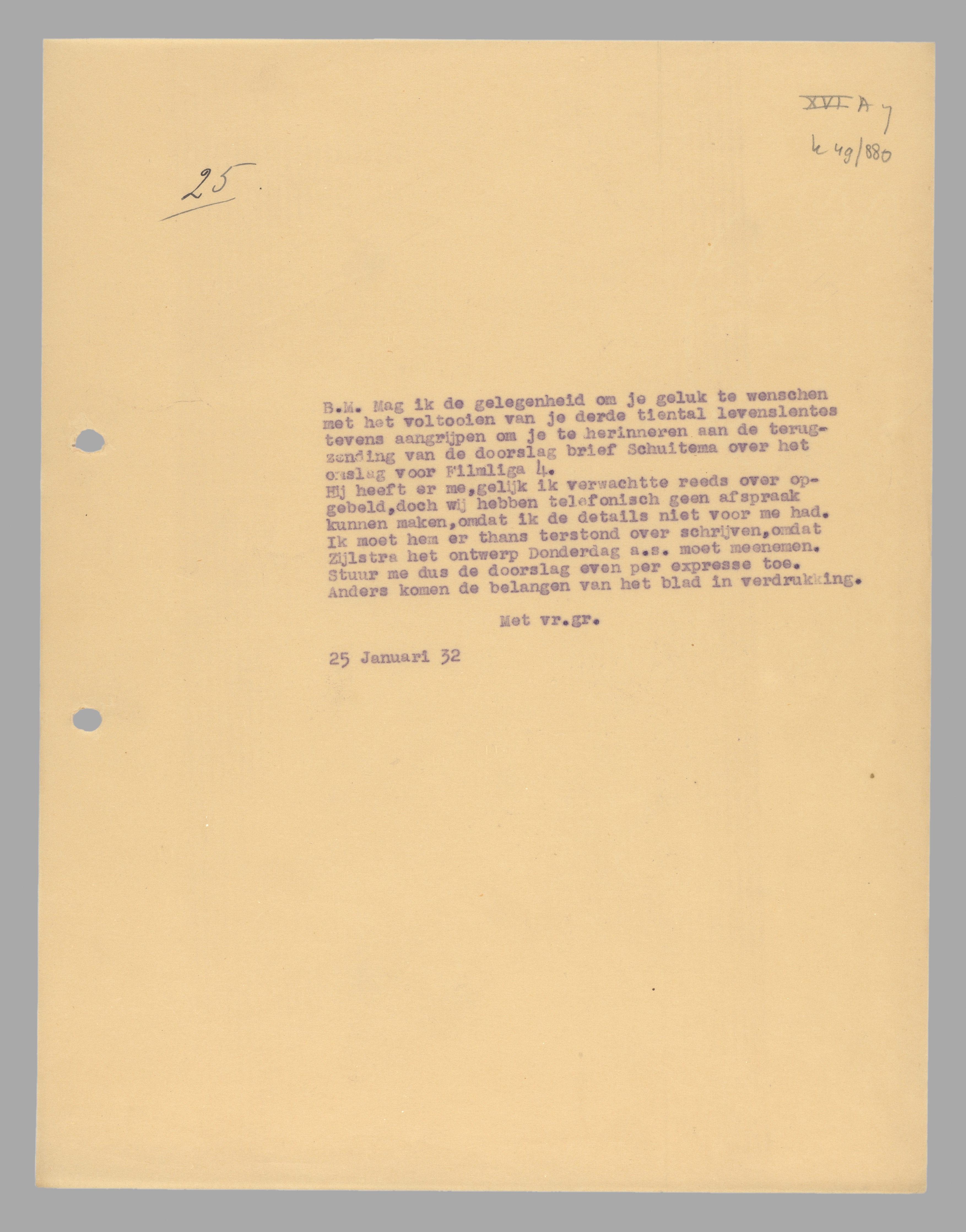 Mag ik de gelegenheid om je geluk te wenschen met het voltooien van je derde tiental levenslentes tevens aangrijpen om je te herinneren aan de terugzending van de doorslag brief Schuitema over het omslag voor Filmliga 4.