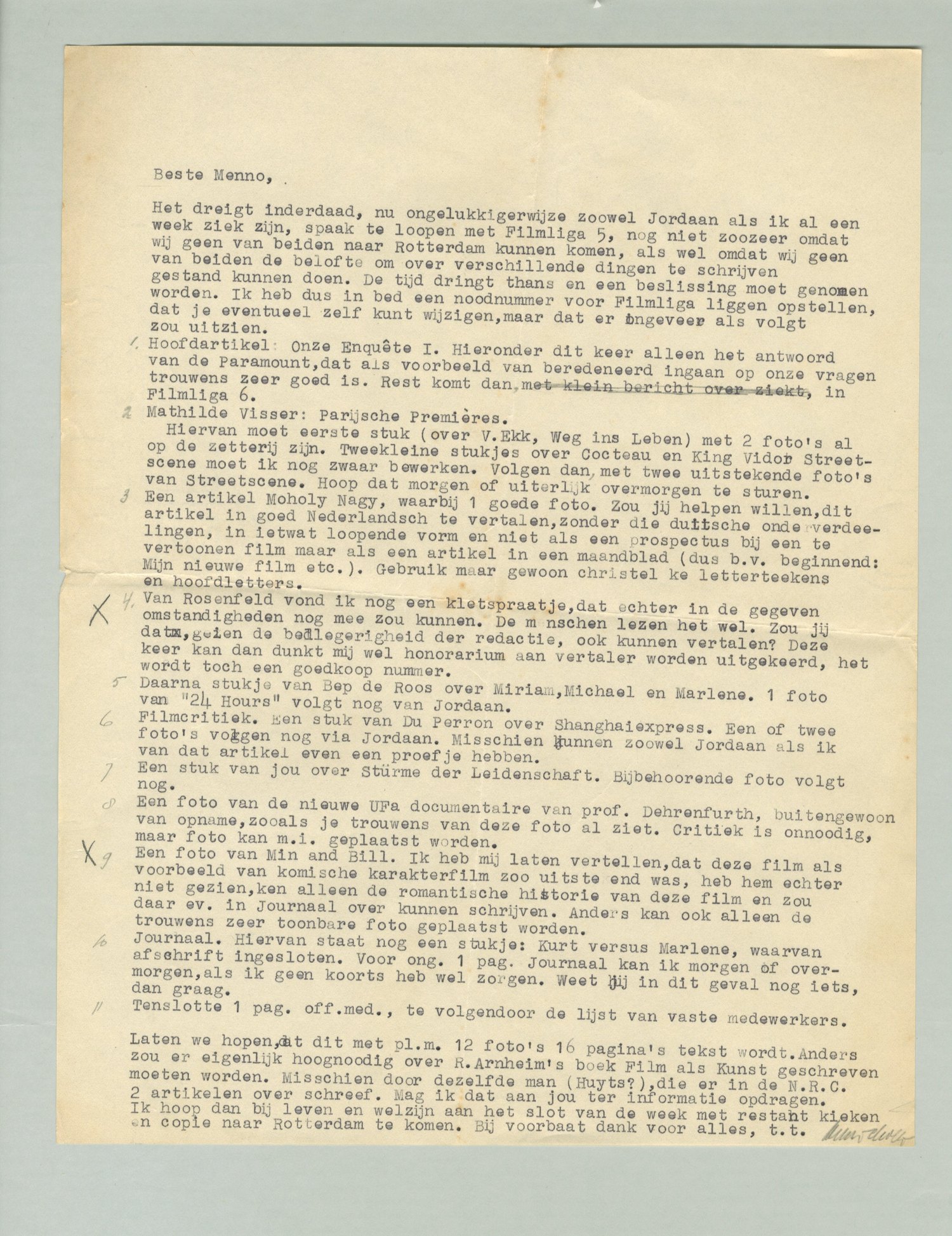 Laten we hopen, dat dit met pl.m. 12 foto's 16 pagina's tekst wordt. Anders zou er eigenlijk hoognoodig over R. Arnheim's boek Film als Kunst geschreven moeten worden. Misschien door dezelfde man (Huyts?), die er in de N.R.C. 2 artikelen over schreef. Mag ik dat aan jou ter informatie opdragen. Ik hoop dan bij leven en welzijn aan het slot van de week met restant kieken en copie naar Rotterdam te komen.