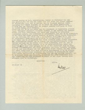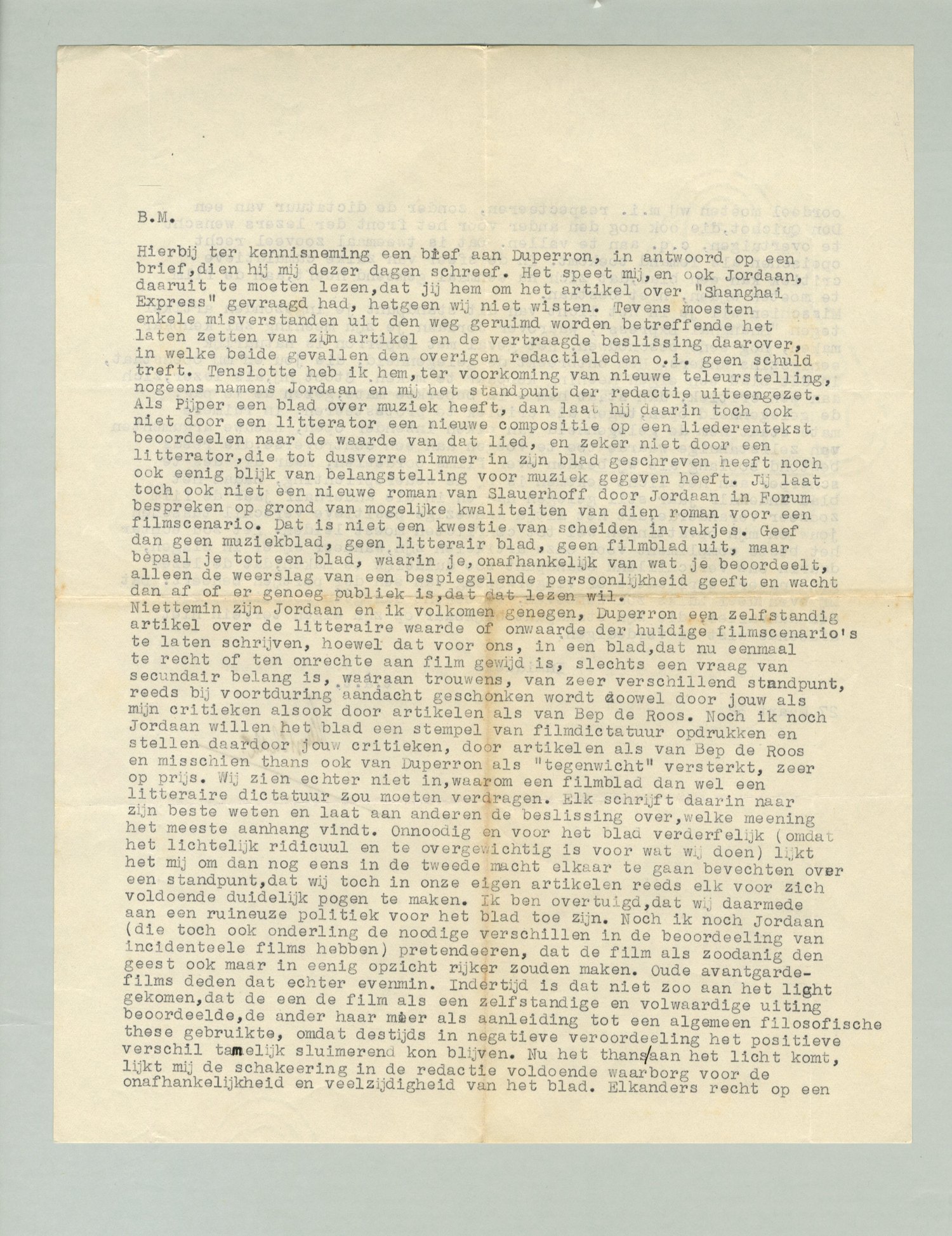 Hierbij ter kennisneming een brief aan Du Perron, in antwoord op een brief, dien hij mij dezer dagen schreef. Het speet mij, en ook Jordaan, daaruit te moeten lezen, dat jij hem om het artikel gevraagd had, hetgeen wij niet wisten. Tevens moesten enkele misverstanden uit den weg geruimd worden betreffende het laten zetten van zijn artikel en de vertraagde beslissing daarover, in welke beide gevallen den overigen redactieleden o.i. geen schuld treft. Tenslotte heb ik hem, ter voorkoming van nieuwe teleurstelling, nogeens namens Jordaan en mij het standpunt der redactie uiteengezet. Als Pijper een blad over muziek heeft, dan laat hij daarin toch ook niet door een litterator een nieuwe compositie op een liederentekst beoordeelen naar de waarde van dat lied, en zeker niet door een litterator, die tot dusverre nimmer in zijn blad geschreven heeft noch ook eenig blijk van belangstelling voor muziek gegeven heeft. Jij laat toch ook niet een nieuwe roman van Slauerhoff door Jordaan in Forum bespreken op grond van mogelijke kwaliteiten van dien roman voor een filmscenario. Dat is niet een kwestie van scheiden in vakjes. Geef dan geen muziekblad, geen litterair blad, geen filmblad uit, maar bepaal je tot een blad, waarin je, onafhankelijk van wat je beoordeelt, alleen de weerslag van een bespiegelende persoonlijkheid geeft en wacht dan af of er genoeg publiek is, dat dat lezen wil.