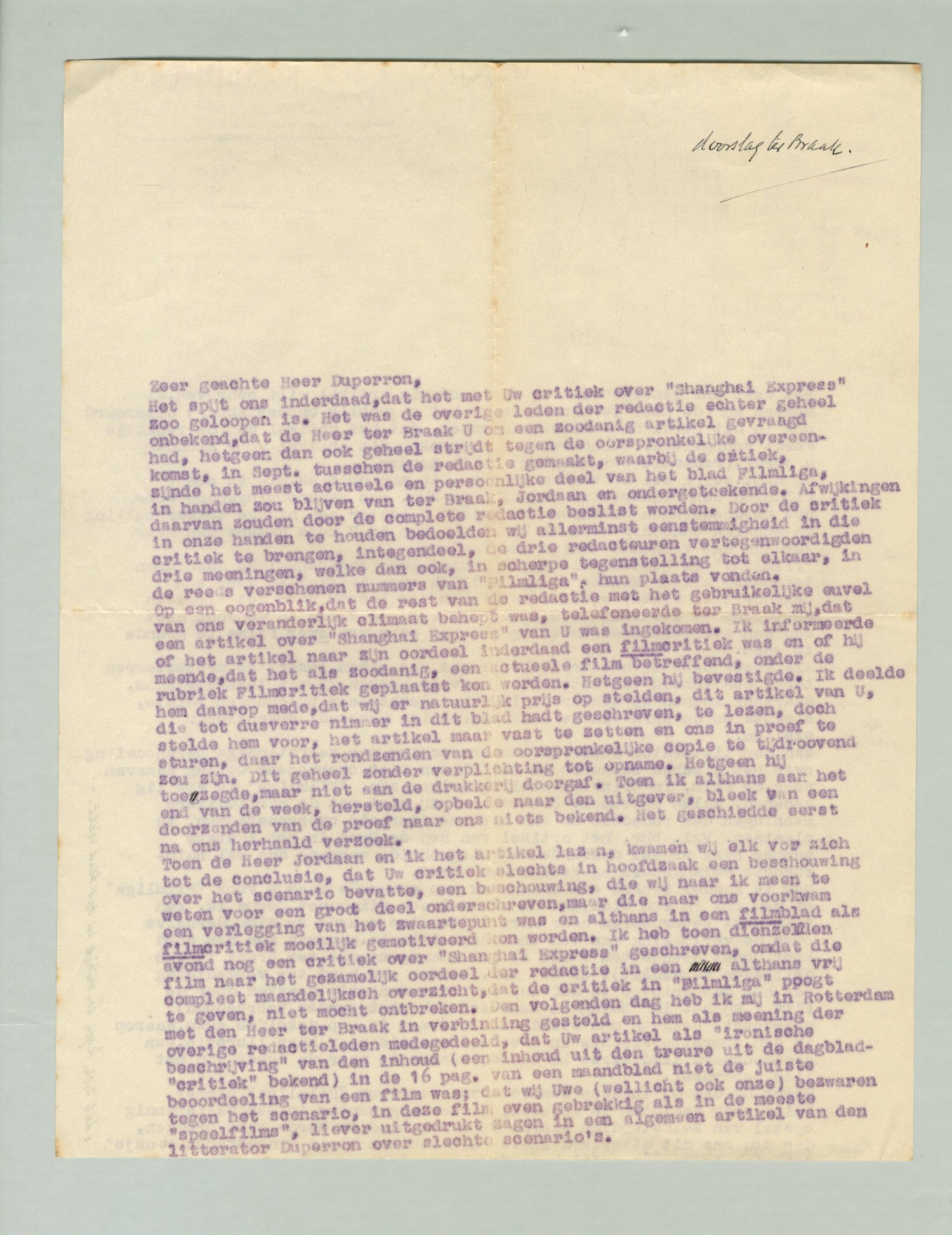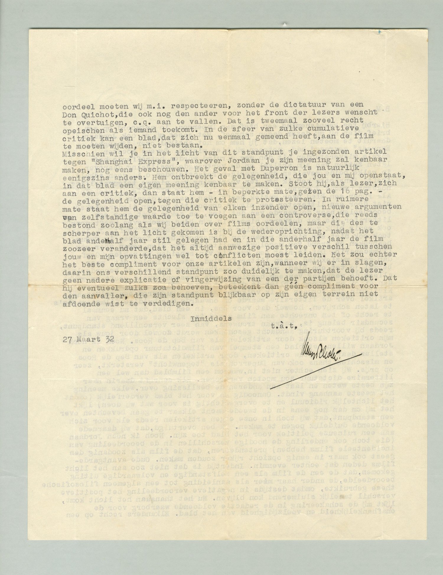Misschien wil je in het licht van dit standpunt je ingezonden artikel tegen Shanghai Express, waarover Jordaan je zijn meening zal kenbaar maken, nog eens beschouwen. Het geval met Duperron is natuurlijk eenigszins anders. Hem ontbreekt de gelegenheid, die jou en mij openstaat, in dat blad een eigen meening kenbaar te maken. Stoot hij, als lezer, zich aan een critiek, dan staat hem - in beperkte mate, gezien de 16 pag. - de gelegenheid open, tegen die critiek te protesteeren. In ruimere mate staat hem de gelegenheid van elken inzender open, nieuwe argumenten van zelfstandige waarde toe te voegen aan een controverse, die reeds bestond zoolang als wij beiden over films oordeelen, maar die des te scherper aan het licht gekomen is bij de wederoprichting, nadat het blad anderhalf jaar stil gelegen had en in die anderhalf jaar de film zoozeer veranderde, dat het altijd aanwezige positieve verschil tusschen jouw en mijn opvattingen wel tot conflicten moest leiden. Het zou echter het beste compliment voor onze artikelen zijn, wanneer wij er in slagen, daarin ons verschillend standpunt zoo duidelijk te maken, dat de lezer geen nadere explicatie of vingerwijzing van een der partijen behoeft. Dat hij eventueel zulks zou behoeven, beteekent dan géén compliment voor den aanvaller, die zijn standpunt blijkbaar op zijn eigen terrein niet afdoende wist te verdedigen.