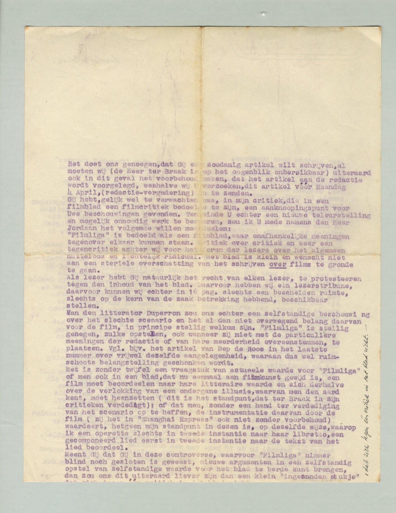 Niettemin zijn Jordaan en ik volkomen genegen, Duperron een zelfstandig artikel over de litteraire waarde of onwaarde der huidige filmscenario's te laten schrijven, hoewel dat voor ons, in een blad, dat nu eenmaal te recht of ten onrechte aan film gewijd is, slechts een vraag van secundair belang is, waaraan trouwens, van zeer verschillend standpunt, reeds bij voortduring aandacht geschonken wordt zoowel door jouw als mijn critieken alsook door artikelen als van Bep de Roos en misschien thans ook van Duperron als ‘tegenwicht’ versterkt, zeer op prijs. Wij zien echter niet in, waarom een filmblad dan wel een litteraire dictatuur zou moeten verdragen. Elk schrijft daarin naar zijn beste weten en laat anderen de beslissing over, welke meening het meeste aanhang vindt. Onnoodig en voor het blad verderfelijk (omdat het lichtelijk ridicuul en te overgewichtig is voor wat wij doen) lijkt het mij om dan nog eens in de tweede macht elkaar te gaan bevechten over een standpunt, dat wij toch in onze eigen artikelen reeds elk voor zich voldoende duidelijk pogen te maken. Ik ben overtuigd, dat wij daarmede aan een ruineuze politiek voor het blad toe zijn. Noch ik noch Jordaan (die toch ook onderling de noodige verschillen in de beoordeeling van incidenteele films hebben) pretendeeren, dat de film als zoodanig den geest ook maar in eenig opzicht rijker zouden maken. Oude avantgarde-films deden dat echter evenmin. Indertijd is dat niet zoo aan het licht gekomen, dat de een de film als een zelfstandige en volwaardige uiting beoordeelde, de ander haar meer als aanleiding tot een algemeen filosofische these gebruikte, omdat destijds in negatieve veroordeeling het positieve verschil tamelijk sluimerend kon blijven. Nu het thans aan het licht komt, lijkt mij de schakeering in de redactie voldoende waarborg voor de onafhankelijkheid en veelzijdigheid van het blad. Elkanders recht op een oordeel moeten wij m.i. respecteeren, zonder de dictatuur van een Don Quichot, die ook nog den ander voor het front der lezers wenscht te overtuigen, c.q. aan te vallen. Dat is tweemaal zooveel recht opeischen als iemand toekomt. In de sfeer van zulke cumulatieve critiek kan een blad, dat zich nu eenmaal gemeend heeft, aan de film te moeten wijden, niet bestaan.