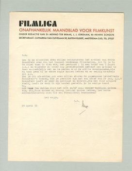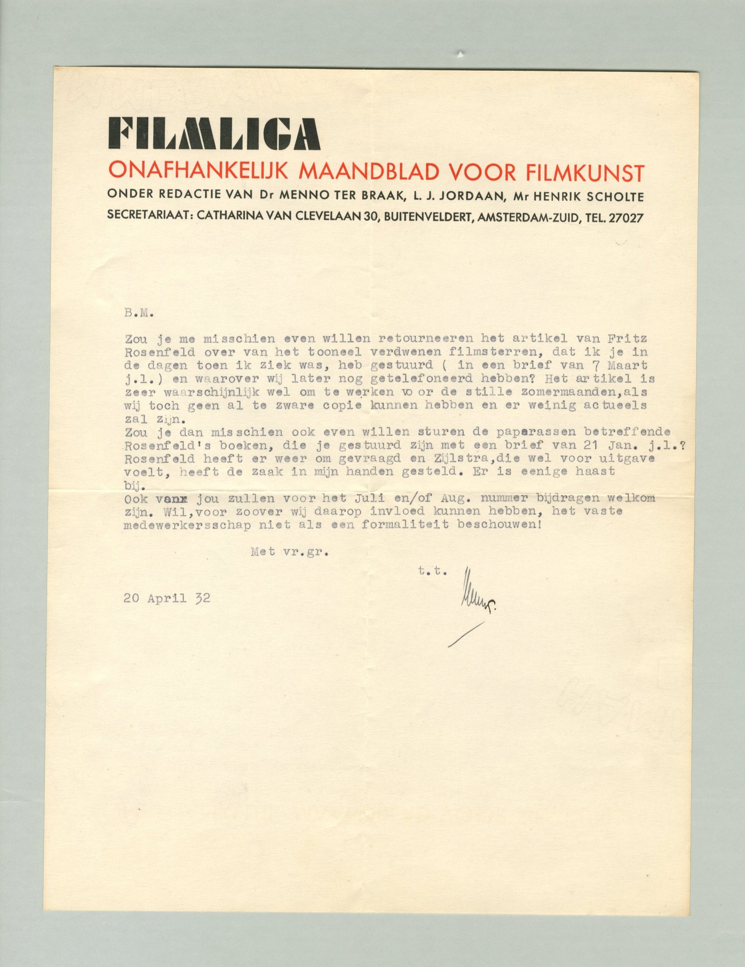 Zou je me misschien even willen retourneeren het artikel van Fritz Rosenfeld over van het tooneel verdwenen filmsterren, dat ik je in de dagen toen ik ziek was, heb gestuurd (in een brief van 7 Maart j.l.) en waarover wij later nog getelefoneerd hebben? Het artikel is zeer waarschijnlijk wel om te werken voor de stille zomermaanden, als wij toch geen al te zware copie kunnen hebben en er weinig actueels zal zijn.