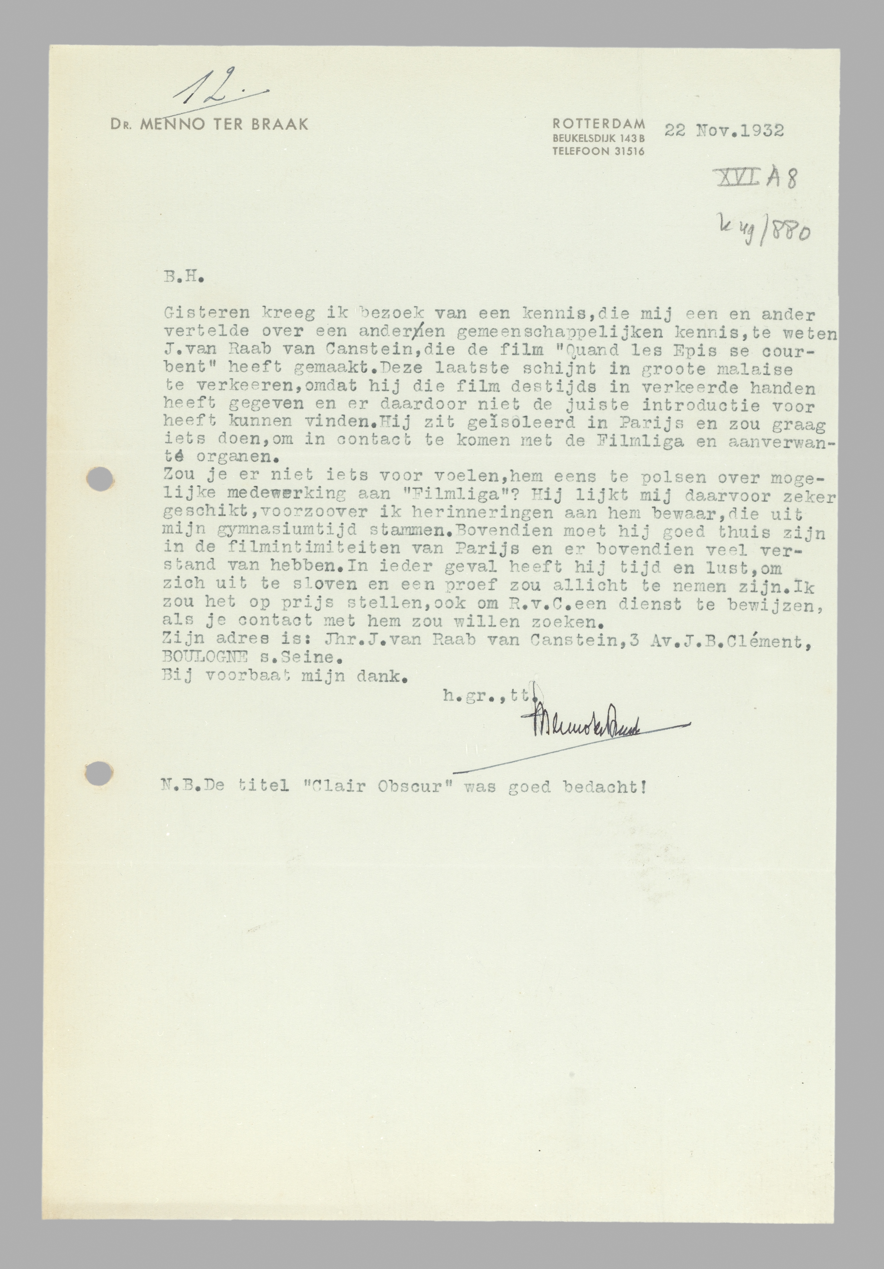Zou je er niet iets voor voelen, hem eens te polsen over mogelijke medewerking aan ‘Filmliga’? Hij lijkt mij daarvoor zeker geschikt, voorzoover ik herinneringen aan hem bewaar, die uit mijn gymnasiumtijd stammen. Bovendien moet hij goed thuis zijn in de filmintimiteiten van Parijs en er bovendien veel verstand van hebben. In ieder geval heeft hij tijd en lust, om zich uit te sloven en een proef zal allicht te nemen zijn. Ik zou het op prijs stellen, ook om R.v.C. een dienst te bewijzen, als je contact met hem zou willen zoeken.