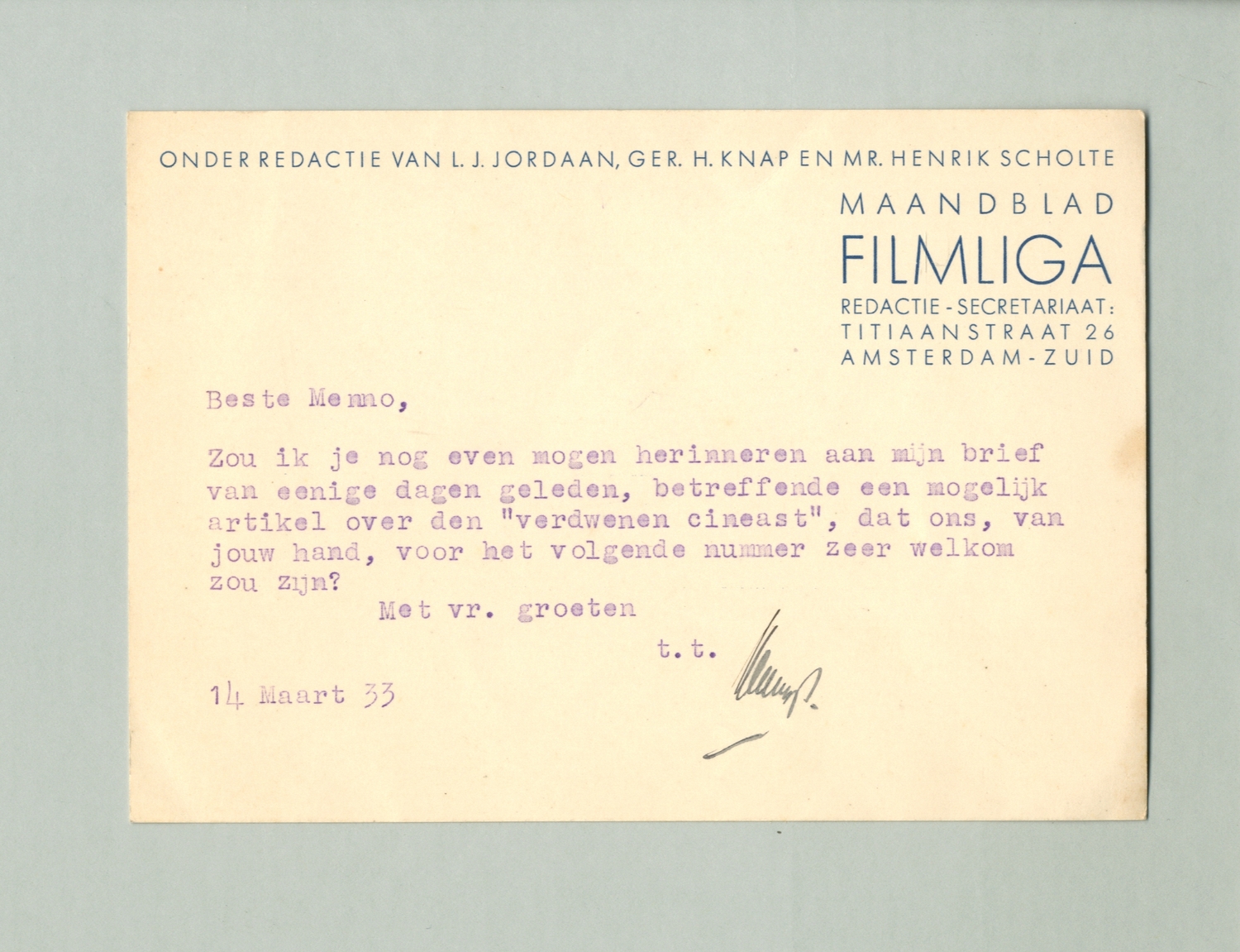 Zou ik je nog even mogen herinneren aan mijn brief van eenige dagen geleden, betreffende een mogelijk artikel over den ‘verdwenen cineast’, dat ons, van jouw hand, voor het volgende nummer zeer welkom zou zijn?