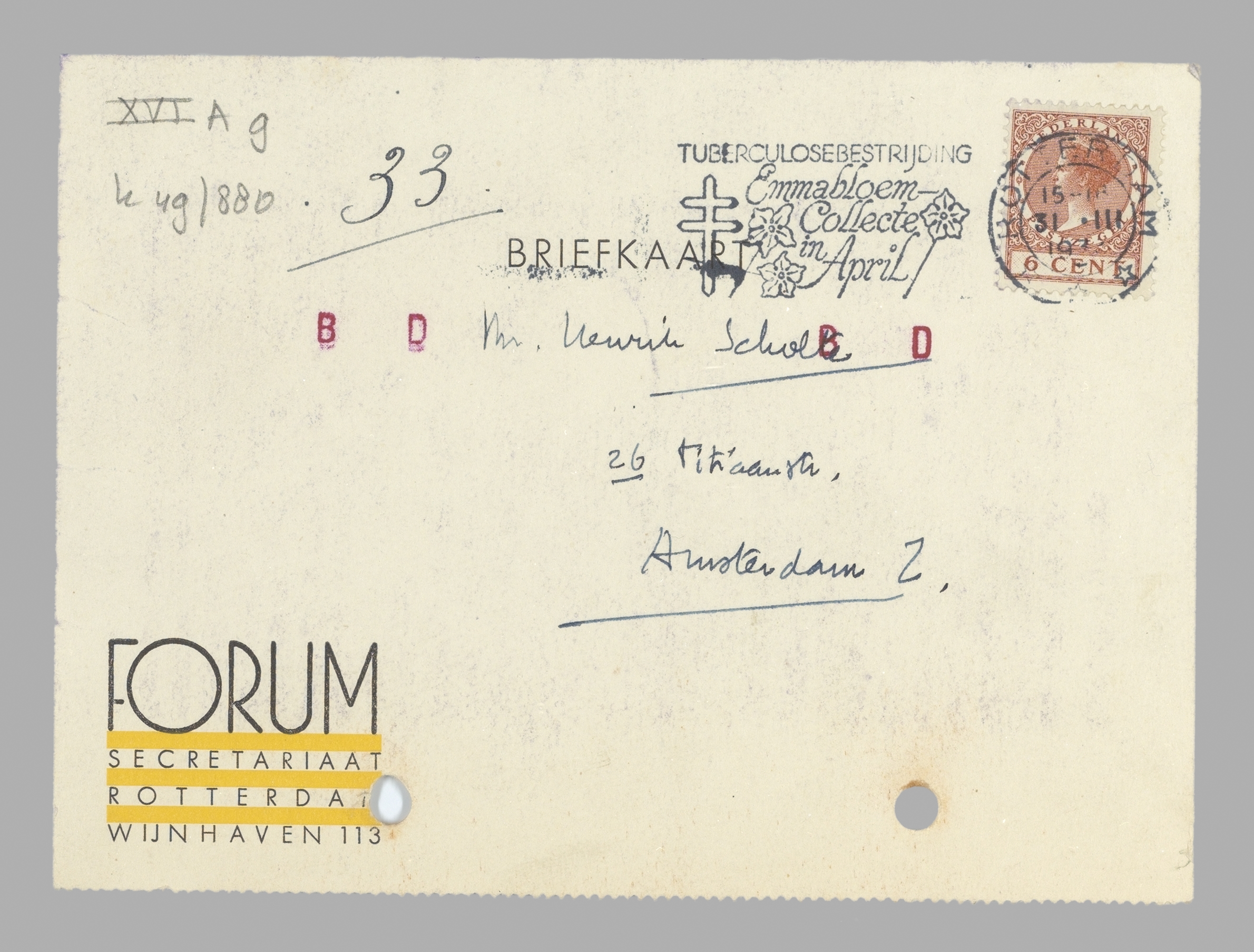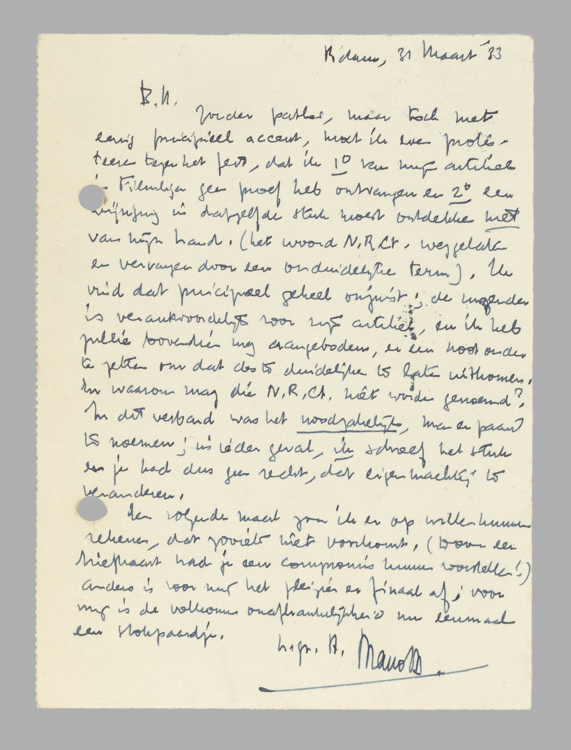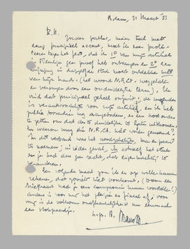 Zonder pathos, maar toch met eenig principieel accent, moet ik even protesteeren tegen het feit, dat ik 1o van mijn artikel in Filmliga geen proef heb ontvangen en 2o een wijziging in datzelfde stuk moest ontdekken niet van mijn hand. (het woord N.R.Ct. weggelaten en vervangen door een onduidelijke term). Ik vind dat principieel geheel onjuist; de inzender is verantwoordelijk voor zijn artikel, en ik heb jullie bovendien nog aangeboden, er een noot onder te zetten om dat des te duidelijker te laten uitkomen. En waarom mag die N.R.Ct. niet worden genoemd? In dit verband was het noodzakelijk, man en paard te noemen; in ieder geval, ik schreef het stuk en je had dus geen recht, dat eigenmachtig te veranderen.