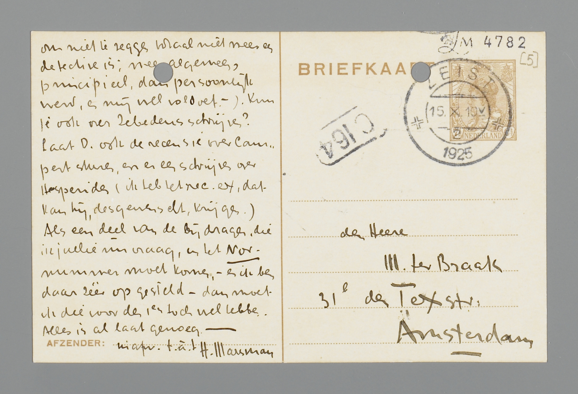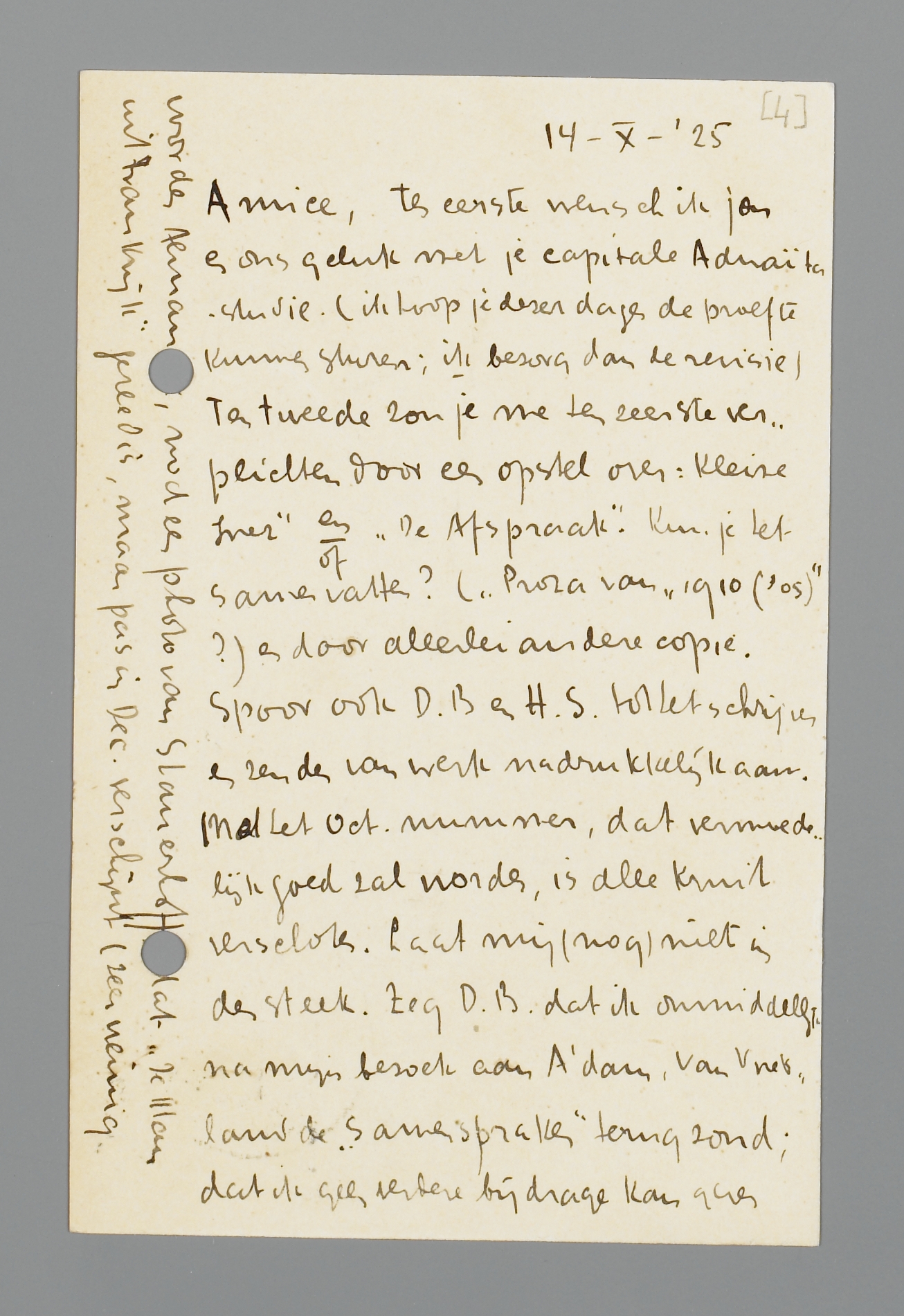 Ten eerste wensch ik jou en ons geluk met je capitale Adwaïta-studie (ik hoop je dezer dagen de proef te kunnen sturen; ik bezorg dan de revisie). Ten tweede zou je me ten zeerste verplichten door een opstel over ‘Kleine Inez’ en ‘De Afspraak’. Kun je het samenvatten? (‘proza van “1910 ('05)”?’) en door allerlei andere copie. Spoor ook D.B. en H.S. tot het schrijven en zenden van werk nadrukkelijk aan. Met het Oct. nummer, dat vermoedelijk goed zal worden, is alle kruit verschoten. Laat mij (nog) niet in den steek. Zeg D.B. dat ik onmiddellijk na mijn bezoek aan A'dam, Van Vriesland de ‘Samenspraken’ terugzond; dat ik geen verdere bijdrage kan geven voor den Almanak, noch een photo van Slauerhoff, dat ‘De Man uit Frankrijk’ gereed is, maar pas in Dec. verschijnt (zeer weinig om niet te zeggen totaal niet meer een detective is; meer algemeen, principieel, dan persoonlijk werd, en mij wel voldoet. ). Kun je ook over Zebedeus schrijven?