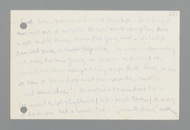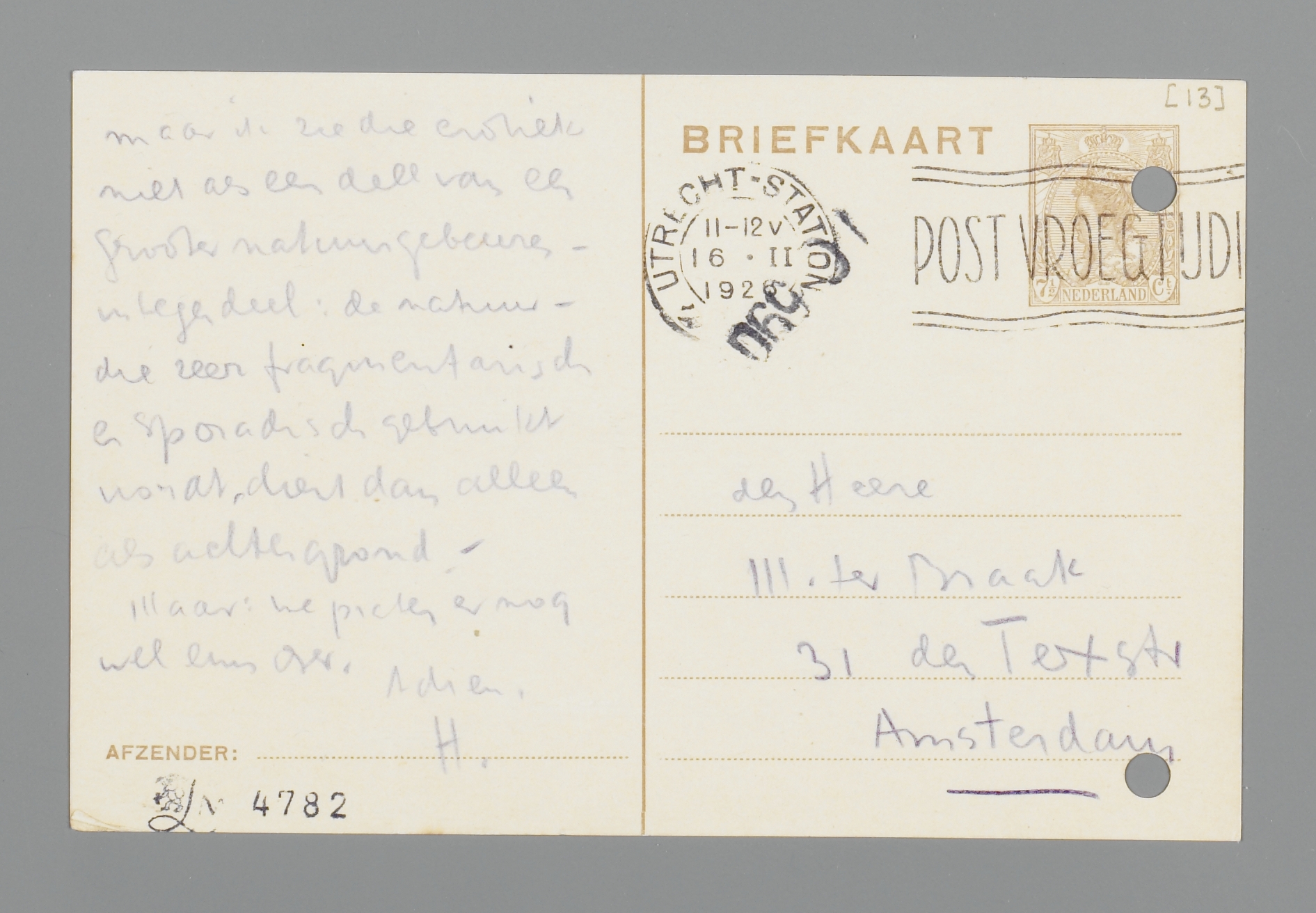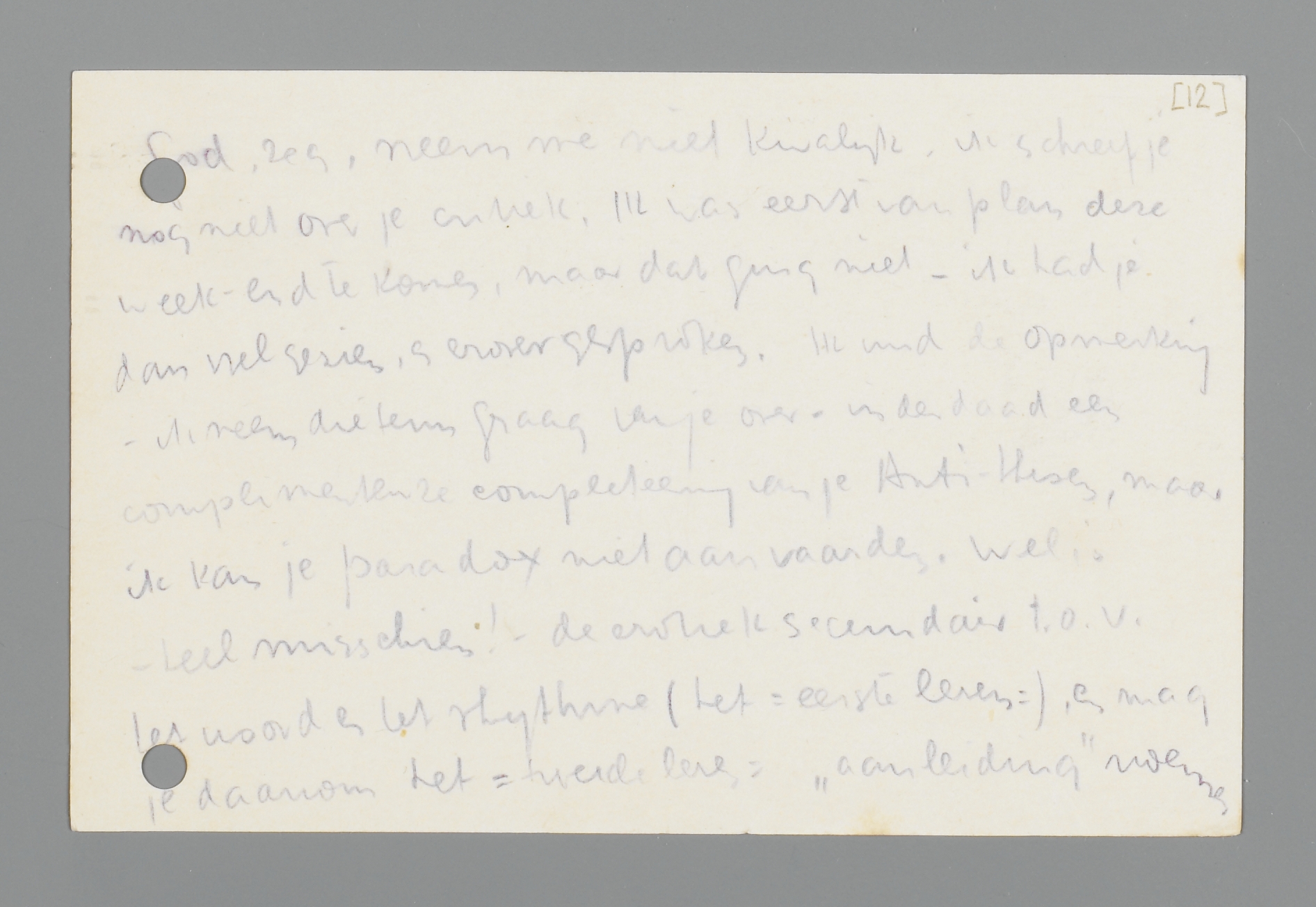 God zeg, neem me niet kwalijk. Ik schreef je nog niet over je critiek. Ik was eerst van plan deze week-end te komen, maar dat ging niet - ik had je dan wel gezien en erover gesproken. Ik vind de opmerking - ik neem die term graag van je over - inderdaad een complimenteuze completeering van de Anti-thesen, maar ik kan je paradox niet aanvaarden. Wel is - heel misschien! - de erotiek secundair t.o.v. het woord en het rhythme (het ‘eerste leren’) en mag je daarom het ‘tweede leren’ ‘aanleiding’ noemen maar ik zie die erotiek niet als een deel van een grooter natuurgebeuren - integendeel: de natuur, die zeer fragmentarisch en sporadisch gebruikt wordt, dient dan alleen als achtergrond.