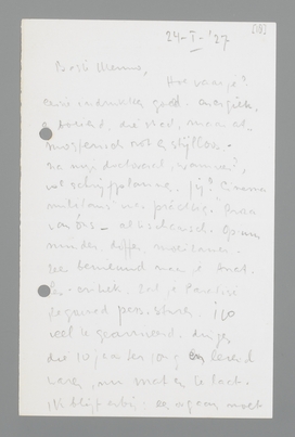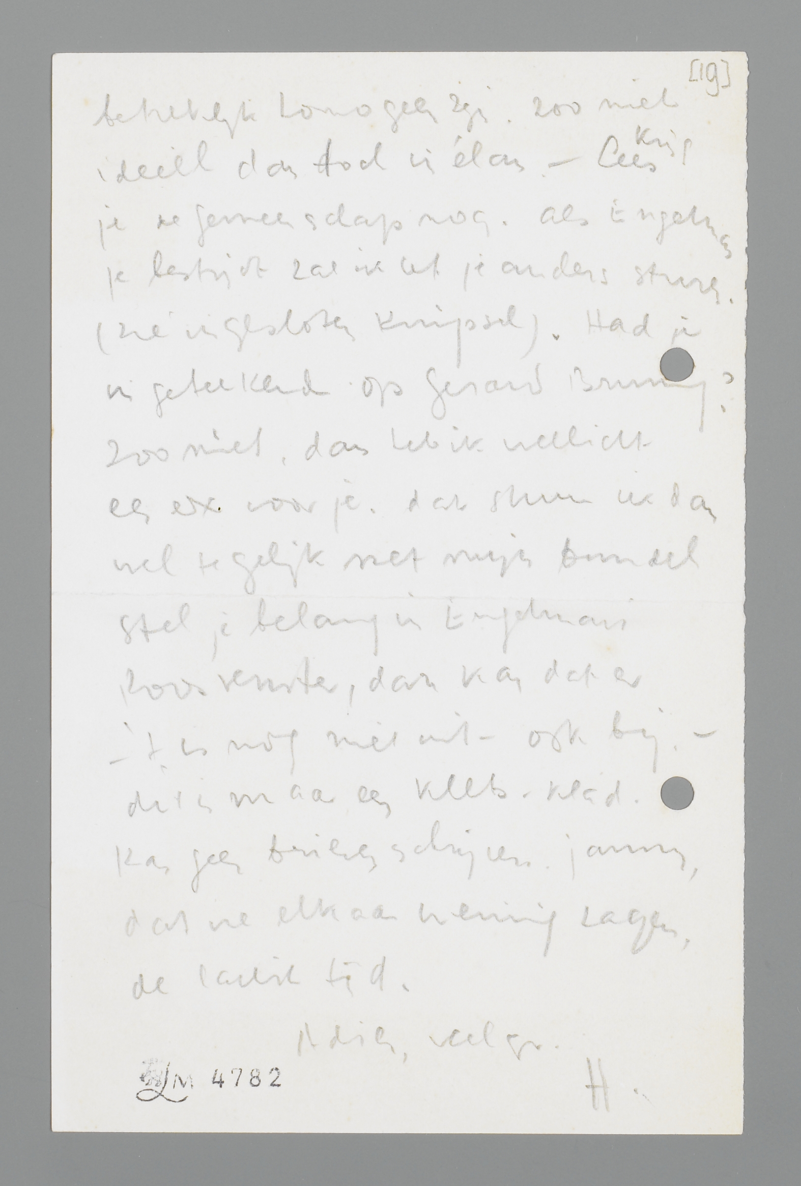 Hoe vaar je? eerste indrukken goed. energiek en boeiend, die stad, maar atmosferisch rot en stijlloos. Na mijn doctoraal, wanneer?, vol schrijfplannen. Jij? ‘Cinema militans’ was práchtig. Proza van óns - al te schaarsch. Opium minder, doffer, moeizamer. Zeer benieuwd naar je Anat. Les-critiek. Zal je Paradise Regained pers. sturen. i10 veel te gearriveerd. dingen die 10 jaar her jong en levend waren, nu mat en te laat. Ik blijf erbij: een orgaan moet betreklijk homogeen zijn. zoo niet ideëel, dan toch in élan. Lees <Krijg> je de Gemeenschap nog. Als Engelman je bestrijdt zal ik het je anders sturen. (zie ingesloten knipsel.) Had je ingeteekend op Gerard Bruning? Zoo niet, dan heb ik wellicht een ex. voor je. dat stuur ik dan wel tegelijk met mijn bundel. Stel je belang in Engelmans Roosvenster, dan kan dat er - 't is nog niet uit - ook bij. - dit is maar een klets-klad. Kan geen brieven schrijven. Jammer dat we elkaar weinig zagen de laatste tijd.