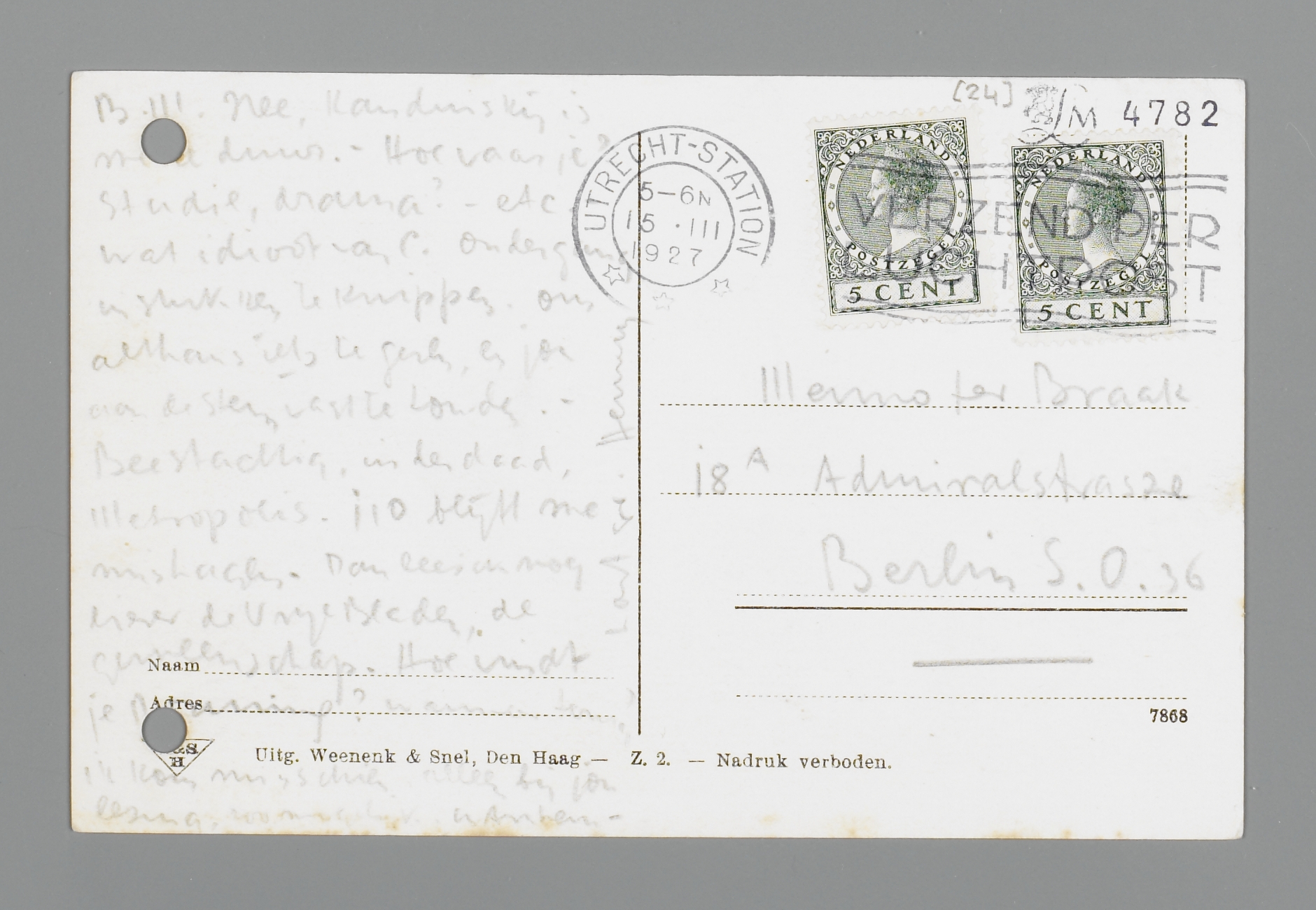 Nee, Kandinsky is me te duur. Hoe vaar je? Studie, drama? - etc. Wat idioot van C. Ondergang in stukken te knippen. Ons althans iets te gek, en jou aan de Stem vast te houden. Beestachtig, inderdaad, Metropolis. i10 blijft me mishagen. Dan lees ik nog liever de Vrije Bladen, de Gemeenschap. Hoe vindt je Bruning? wanneer [terug]? ik kom misschien alleen bij jou lezing, zoo mogelijk, in Arnhem.