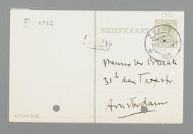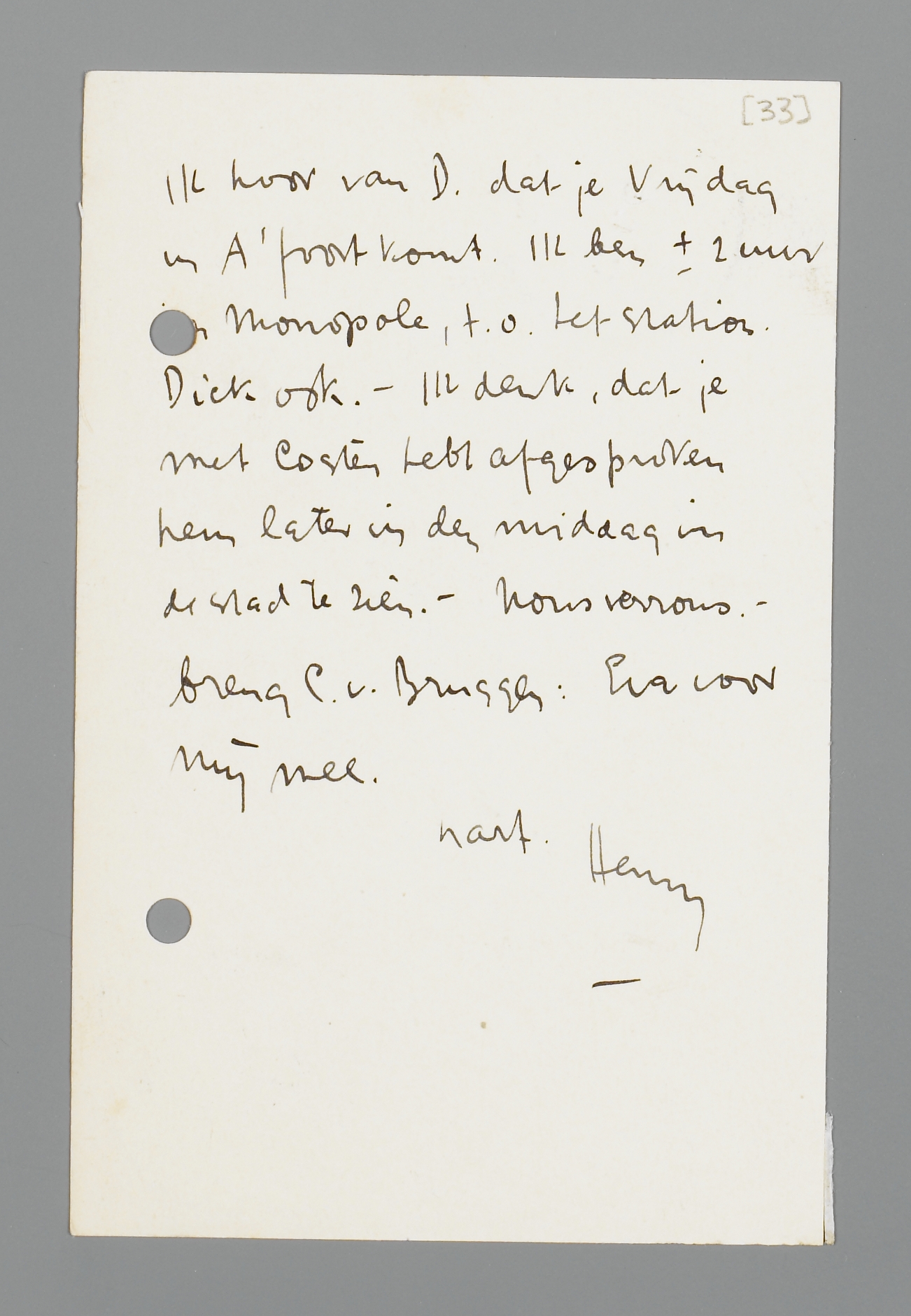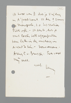 Ik hoor van D. dat je Vrijdag in A'foort komt. Ik ben ± 2 uur in Monopole, t.o. het station. Dick ook. - Ik denk, dat je met Coster hebt afgesproken hem later in den middag in de stad te zien. - Nous verrons. - breng C. v. Bruggen: Eva voor mij mee.