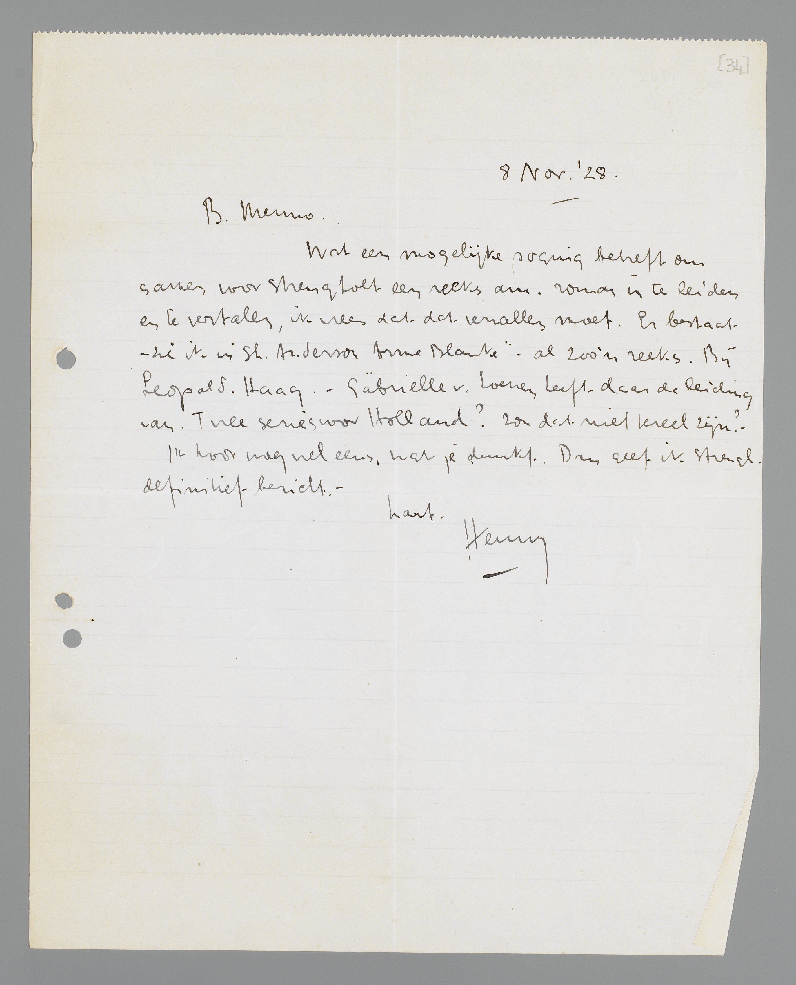Wat een mogelijke poging betreft om samen voor Strengholt een reeks am. romans in te leiden en te vertalen, ik vrees dat dat vervallen moet. Er bestaat - zie ik in Sh. Anderson ‘Arme Blanke’ - al zoo'n reeks. Bij Leopold, Haag. - Gabrielle van Loenen heeft daar de leiding van. Twee series voor Holland? Zou dat niet teveel zijn? Ik hoor nog wel eens, wat je dunkt. Dan geef ik Strengh. definitief bericht. -