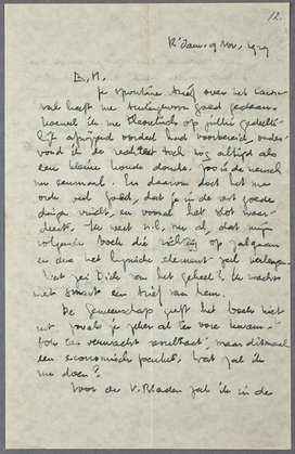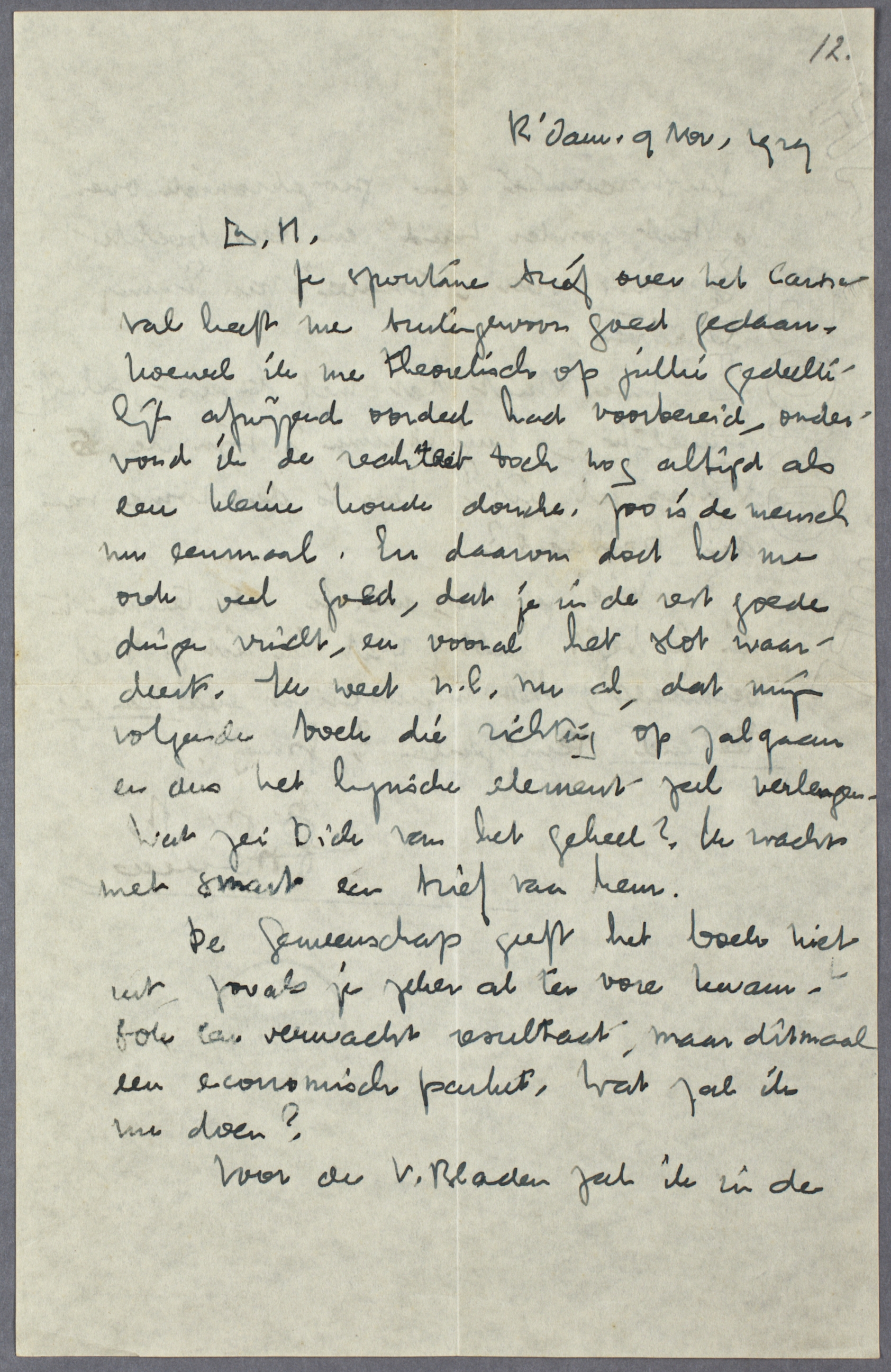 Je spontane brief over het Carnaval heeft me buitengewoon goed gedaan. Hoewel ik me theoretisch op jullie gedeeltelijk afwijzend oordeel had voorbereid, ondervond ik de realiteit toch nog altijd als een kleine koude douche. Zoo ís de mensch nu eenmaal. En daarom doet het me ook veel goed, dat je in de rest goede dingen vindt, en vooral het slot waardeert. Ik weet n.l. nu al, dat mijn volgende boek die richting op zal gaan en dus het lyrische element zal verlengen. Wat zei Dick van het geheel? Ik wacht met smart een brief van hem.