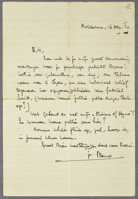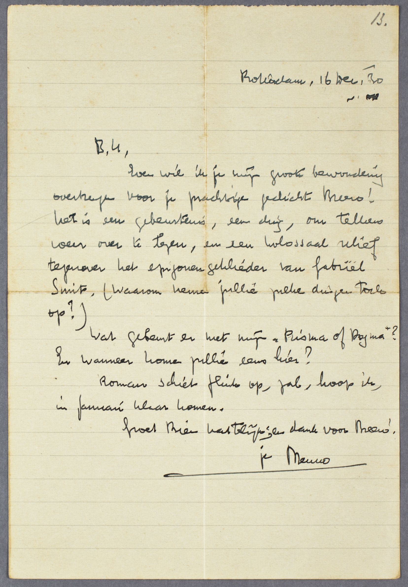 Even wil ik je mijn groote bewondering overbrengen voor je prachtige gedicht Breero! Het is een gebeurtenis, een ding, om telkens weer over te lezen, en een kolossaal relief tegenover het epigonengeklieder van Gabriël Smits. (Waarom nemen jullie zulke dingen toch op?)