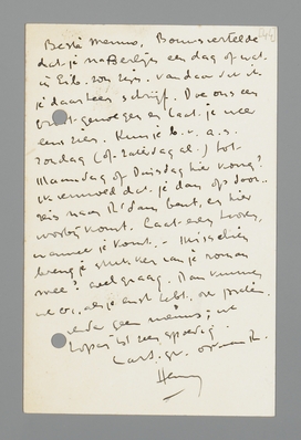 Bouws vertelde dat je na Berlijn een dag of wat in Eib. Zou zijn. Vandaar dat ik je daarheen schrijf. Doe ons een groot genoegen en laat je weer eens zien. Kun je bv. a.s. Zondag (of Zaterdag al) tot Maandag of Dinsdag hier komen? Ik vermoed dat je dan op doorreis naar R'dam bent, en hier voorbij komt. Laat even hooren, wanneer je komt. - Misschien breng je stukken van je roman mee? Heel graag. Dan kunnen we er, als je lust hebt, over praten.
