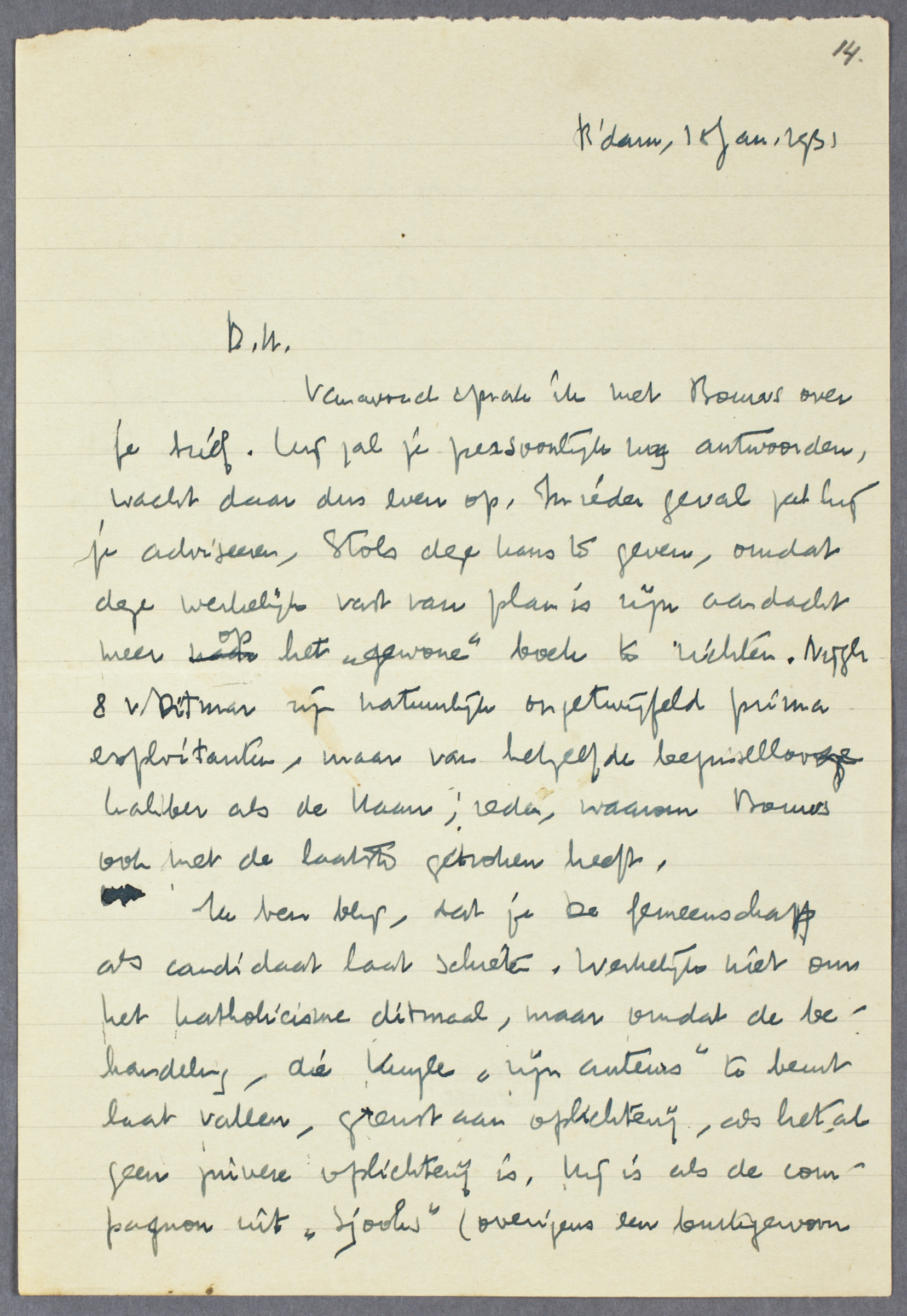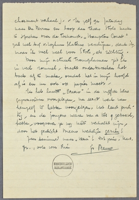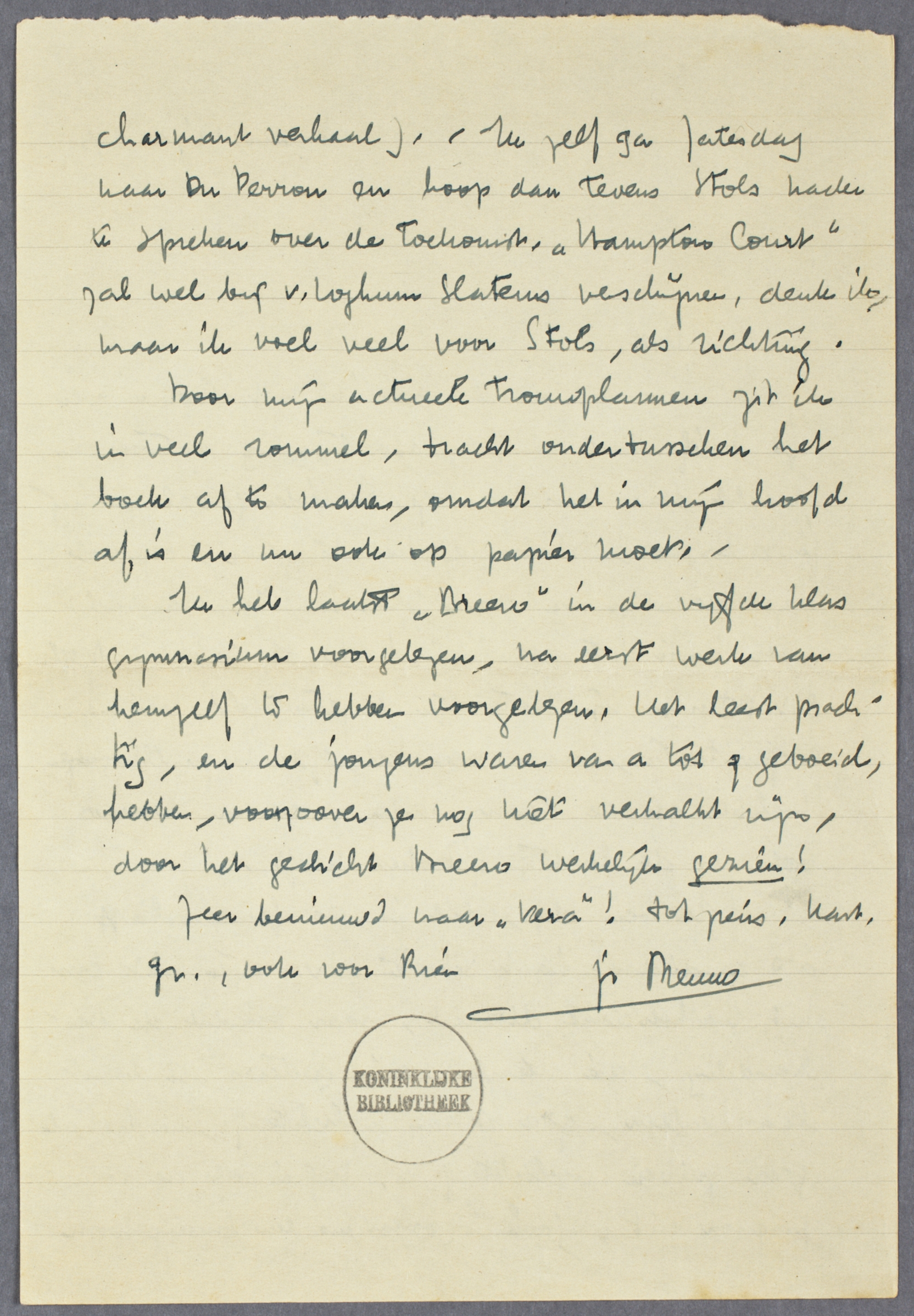 Ik ben blij, dat je De Gemeenschap als candidaat laat schieten. Werkelijk niet om het katholicisme ditmaal, maar omdat de behandeling, die Kuyle ‘zijn auteurs’ te beurt laat vallen, grenst aan oplichterij, als het al geen zuivere oplichterij is. Hij is als de compagnon uit ‘Sjooks’ (overigens een buitengewoon charmant verhaal). Ik zelf ga Zaterdag naar Du Perron en hoop dan tevens Stols nader te spreken over de toekomst. ‘Hampton Court’ zal wel bij v. Loghum Slaterus verschijnen, denk ik, maar ik voel veel voor Stols, als richting.