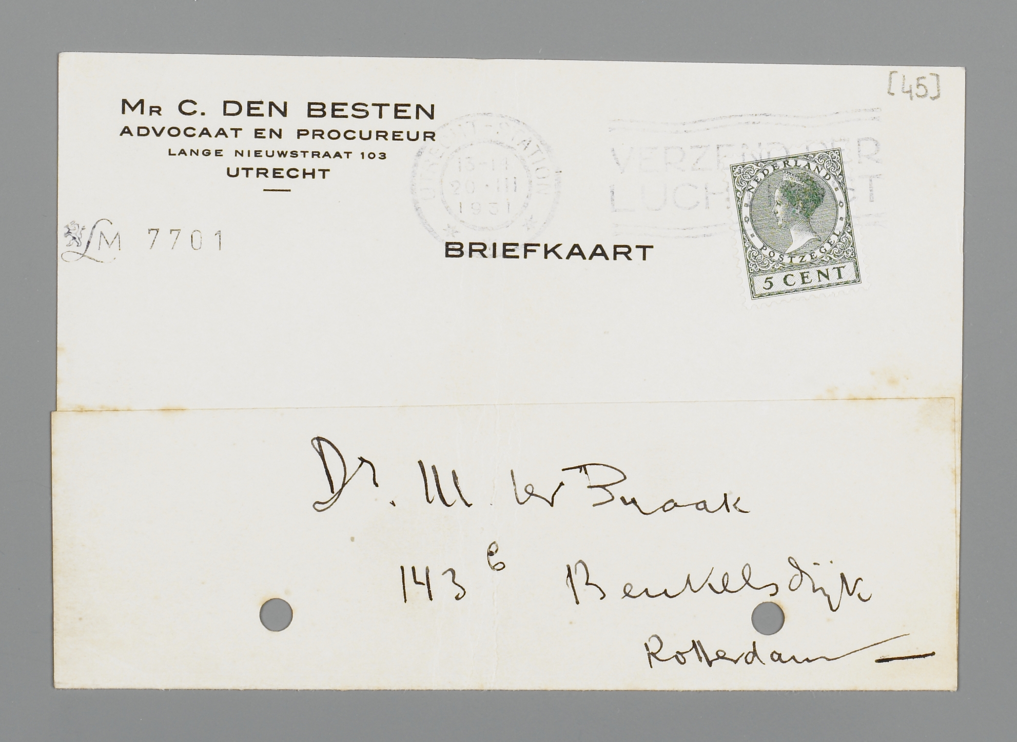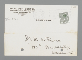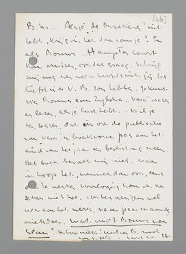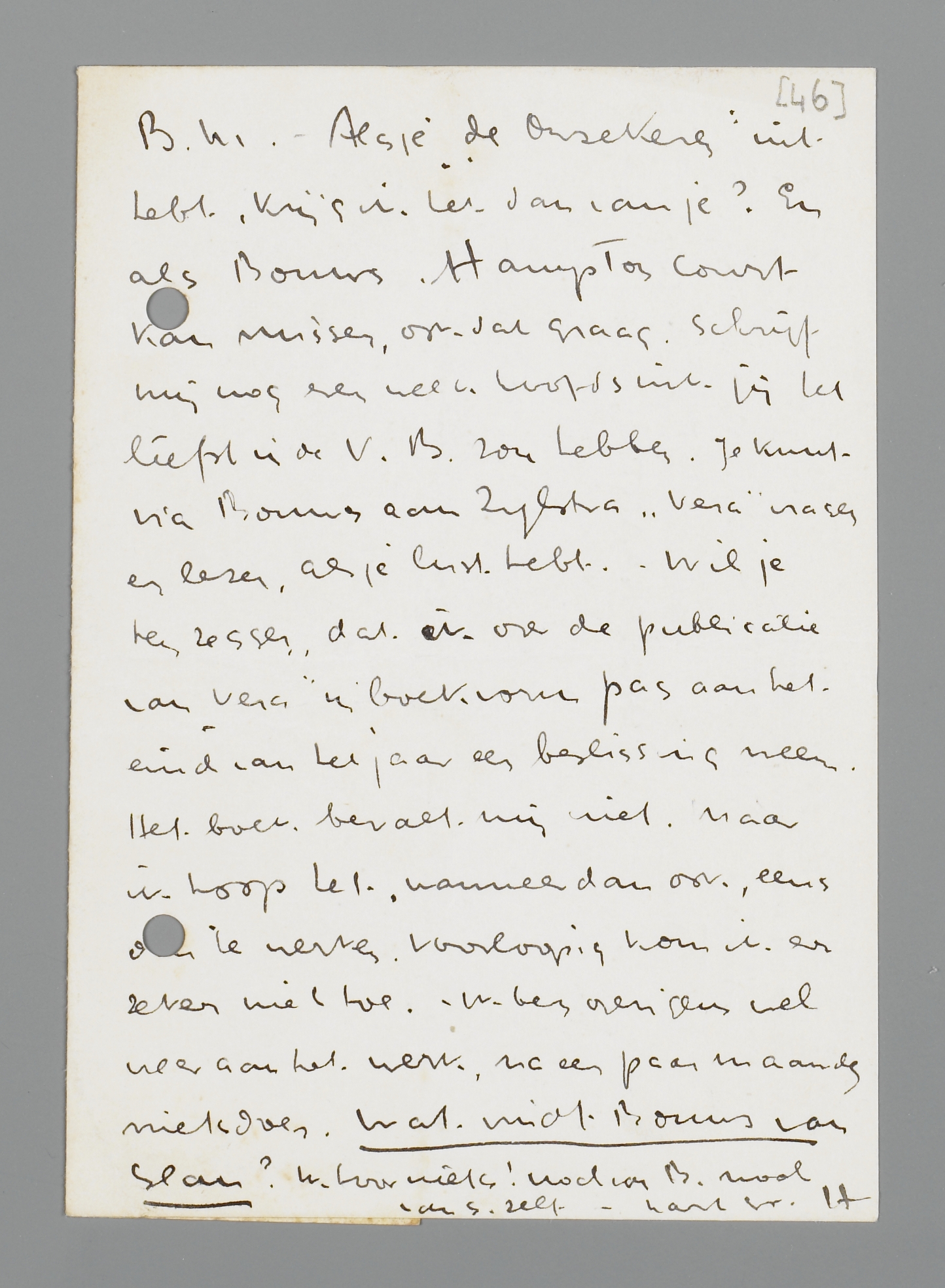 Als je ‘de Onzekeren’ uit hebt, krijg ik het dan van je? En als Bouws Hampton Court kan missen, ook dat graag. Schrijf mij nog even welk hoofdstuk jij het liefst in de V.B. zou hebben. Je kunt via Bouws aan Zijlstra ‘Vera’ vragen en lezen, als je lust hebt. Wil je hem zeggen, dat ik over de publicatie van ‘Vera’ in boekvorm pas aan het eind van het jaar een beslissing neem. Het boek bevalt mij niet, maar ik hoop het, wanneer dan ook, eens om te werken. Voorlopig kom ik er zeker niet toe. Ik ben overigens wel weer aan het werk, na een paar maanden nietsdoen. Wat vindt Bouws van Slau? Ik hoor niets! Noch van B. noch van S. zelf.