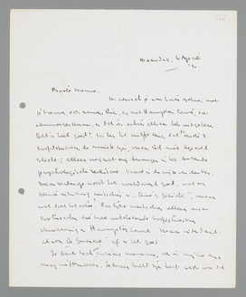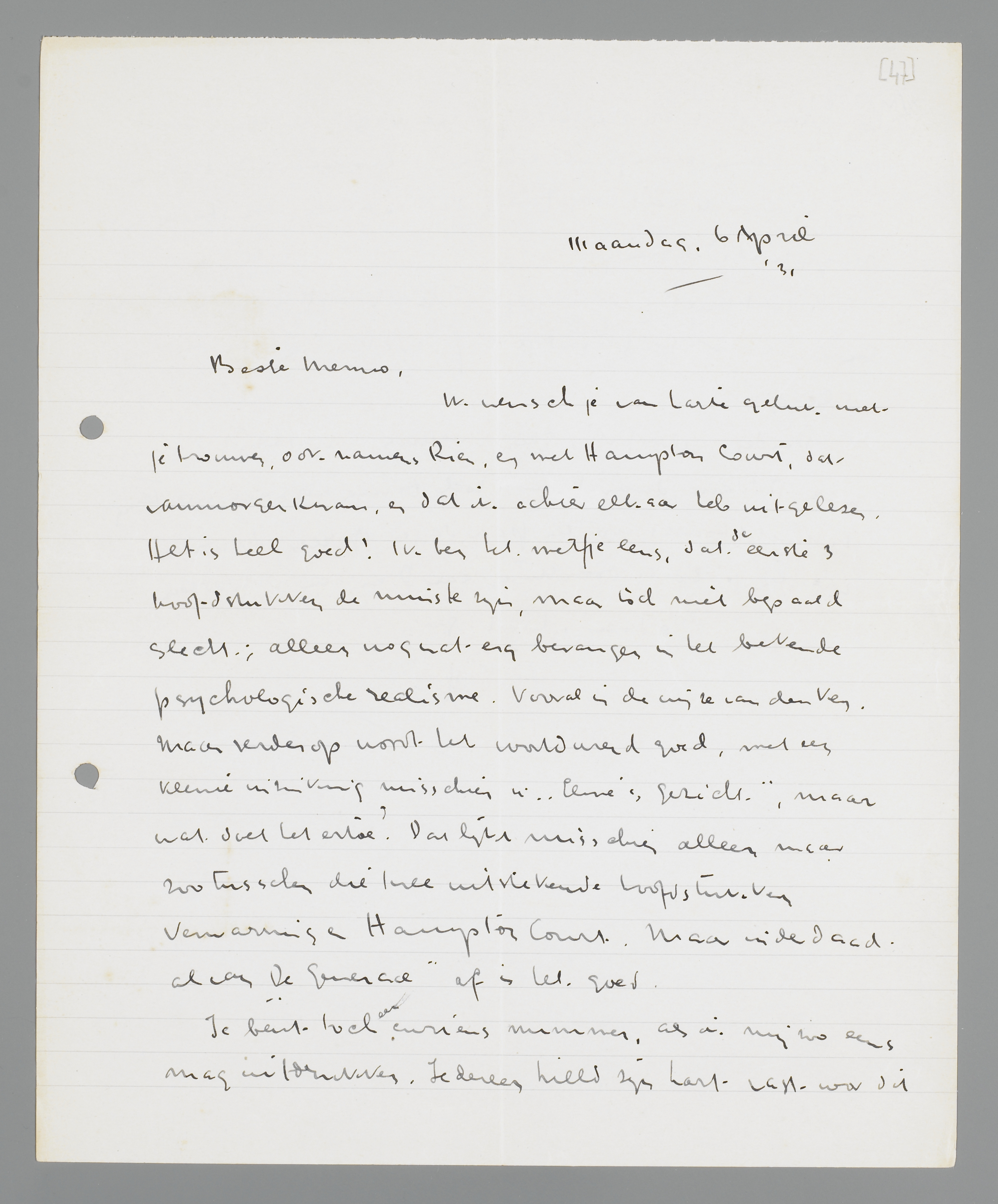 Ik wensch je van harte geluk met je trouwen, ook namens Rien, en met Hampton Court, dat vanmorgen kwam, en dat ik achter elkaar heb uitgelezen. Het is heel goed! ik ben het met je eens, dat de eerste 3 hoofdstukken de minste zijn, maar toch niet bepaald slecht; alleen nog wat erg bevangen in het bekende psychologische realisme. Vooral in de wijze van denken. Maar verderop wordt het voortdurend goed, met een kleine inzinking misschien in ‘Eline's gezicht’, maar wat doet het ertoe? Dat lijkt misschien alleen maar zoo tusschen die twee uitstekende hoofdstukken Verwarring en Hampton Court. Maar inderdaad, al van ‘De Generaal’af is het goed.