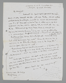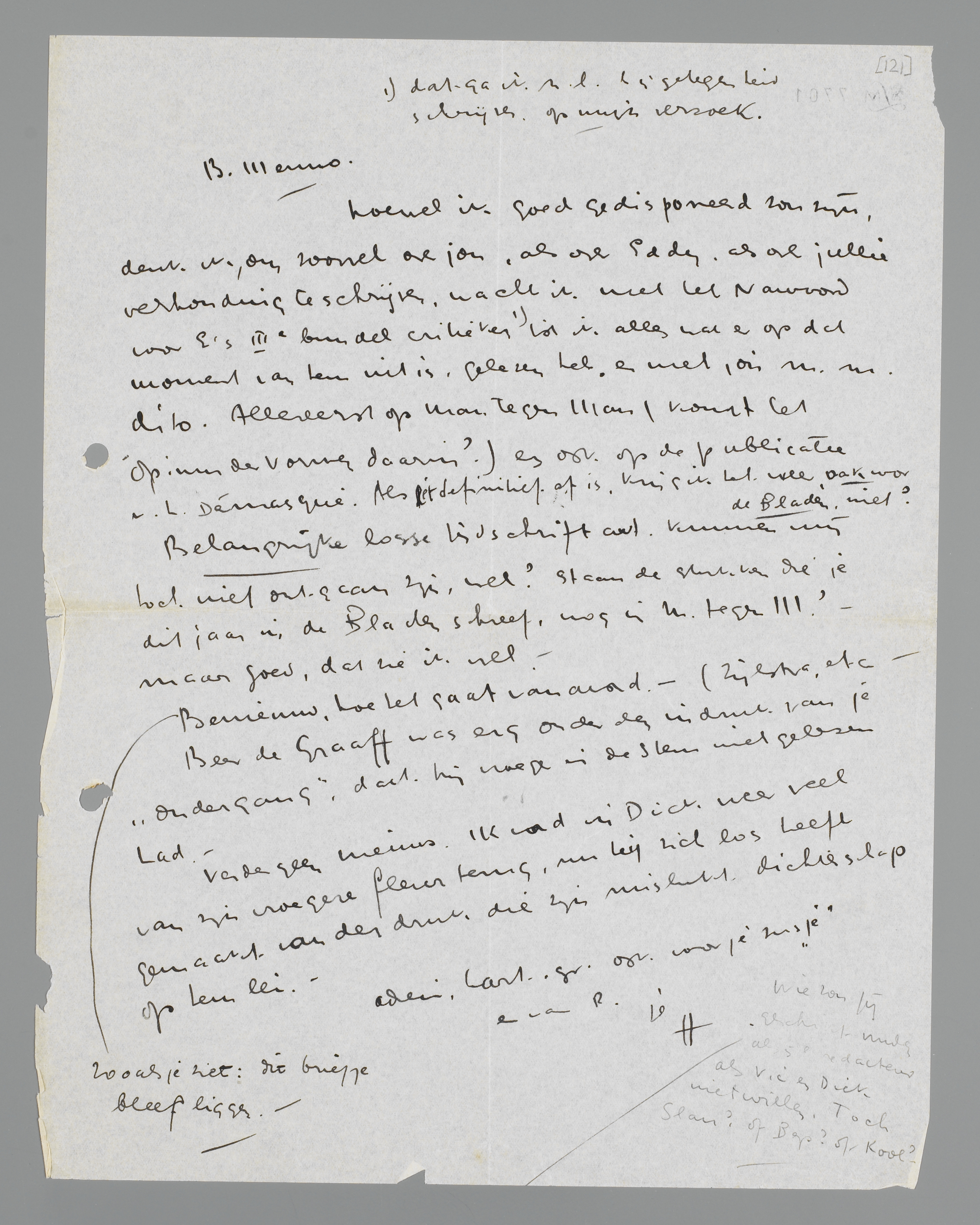 Hoewel ik goed gedisponeerd zou zijn, denk ik, om zoowel over jou, als over Eddy, als over jullie verhouding te schrijven, wacht ik met het Nawoord voor E's IIIe bundel critieken* tot ik alles wat er op dat moment van hem uit is, gelezen heb, en met jou m.m. dito. Allereerst op Man tegen Man. (omt het Opium der Vormen daarin?) en ook op de publicatie van het Démasqué. Als dit definitief af is, krijg ik het wel, ook voor de Bladen, niet? Belangrijke losse tijdschrift art. kunnen mij toch niet ontgaan zijn, wel? Staan de stukken die je dit jaar in de Bladen schreef nog in M. tegen M.?-