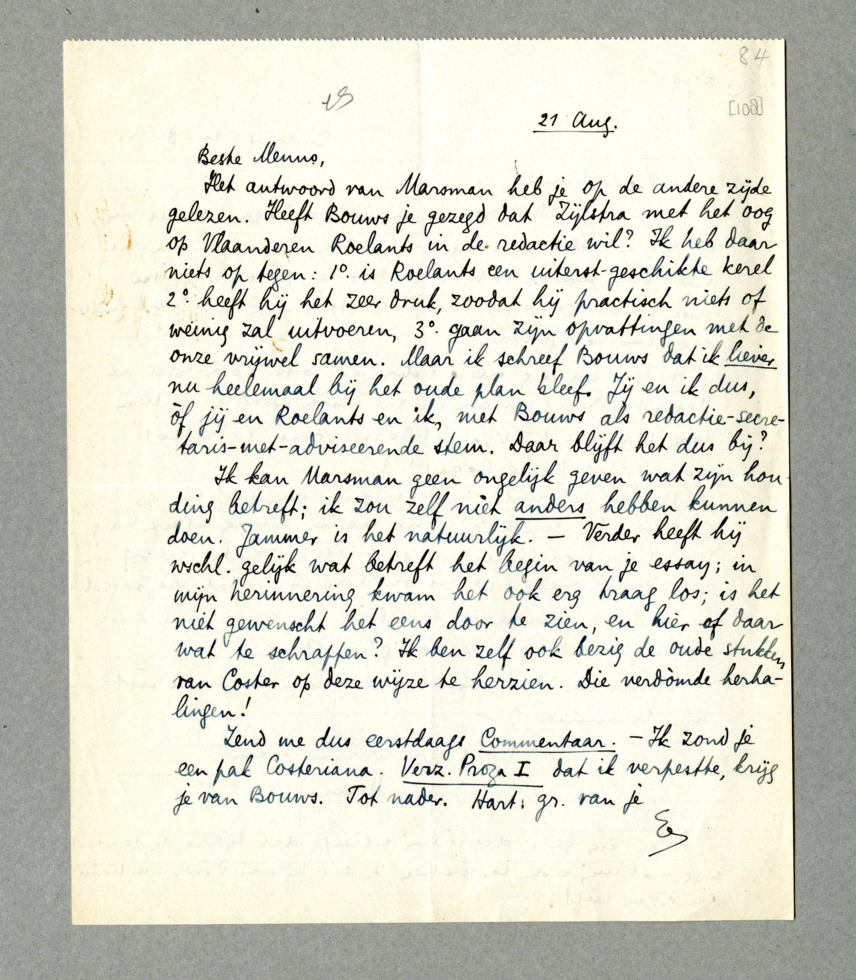 Het doet mij erg veel genoegen, dat je mij graag in jullie redactie wilt hebben, maar ik kan het niet doen tegenover v.W. en de Bladen. Ik sukkel dus meer plichtsgetrouw dan begeesterd nog wat door met die sloome affaire. [...]
