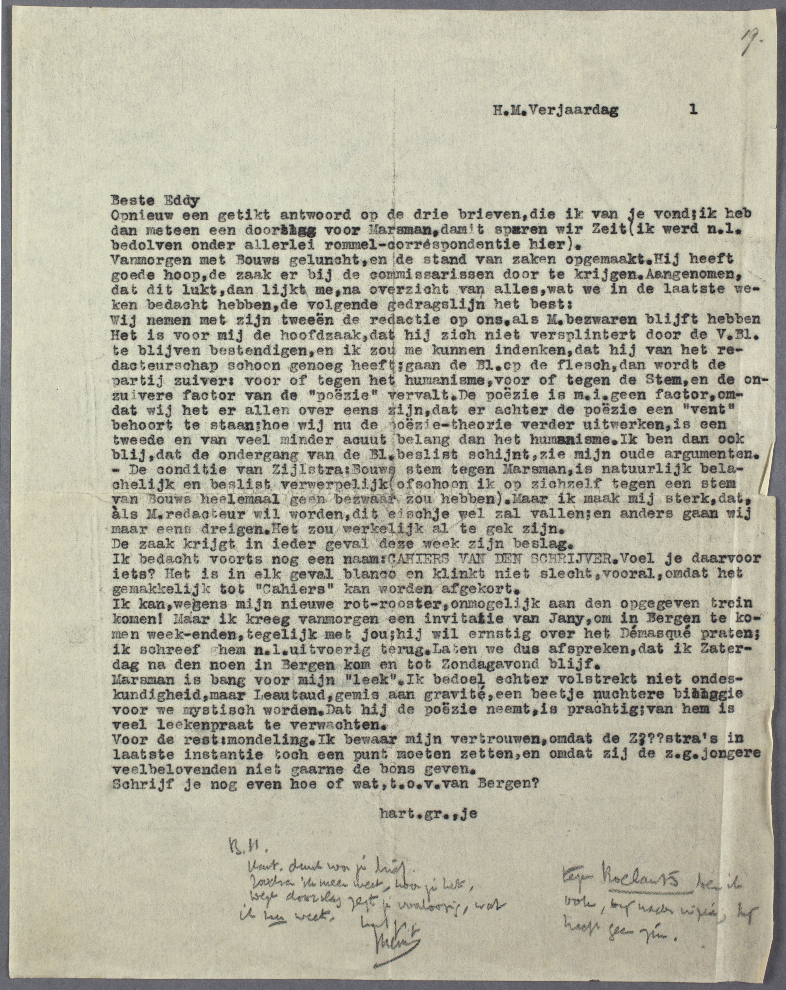 Hart. dank voor je brief. Zoodra ik meer weet, hoor je het. Deze doorslag zegt je voorloopig, wat ik nu weet.