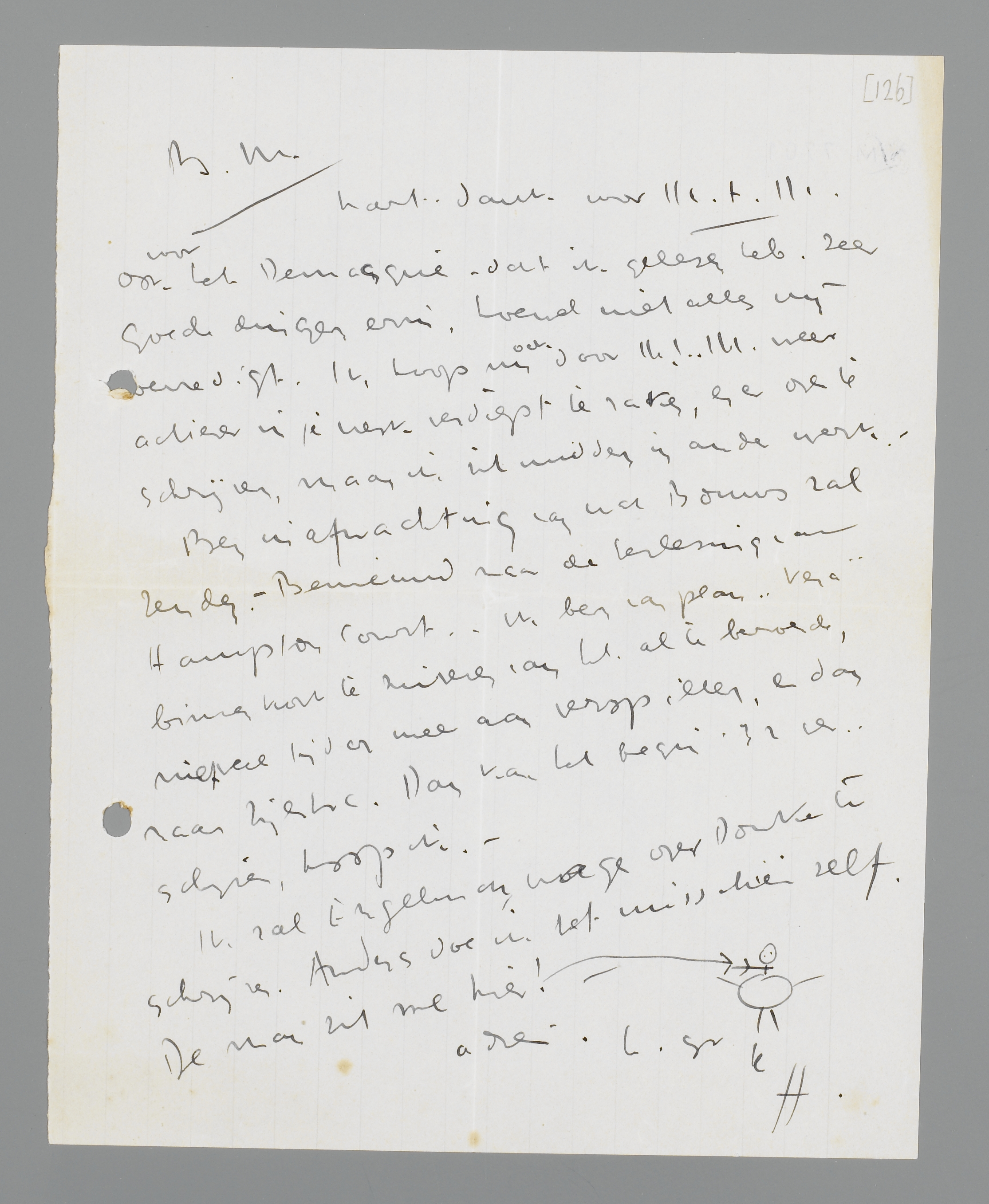 Hart. dank voor M.t.M. Ook voor het Démasqué, dat ik gelezen heb. Zeer goede dingen erin, hoewel niet alles mij bevredigt. Ik hoop nu ook door M.t.M. weer actiever in je werk verdiept te raken, en er over te schrijven, maar ik zit midden in ander werk. - Ben in afwachting van wat Bouws zal zenden. - Benieuwd naar de herlezing van Hampton Court. Ik ben van plan ‘Vera’ binnenkort te zuiveren van het al te beroerde, niet veel tijd er meer aan verspillen, en dan naar Zijlstra. Dan kan het begin '32 verschijnen, hoop ik. -