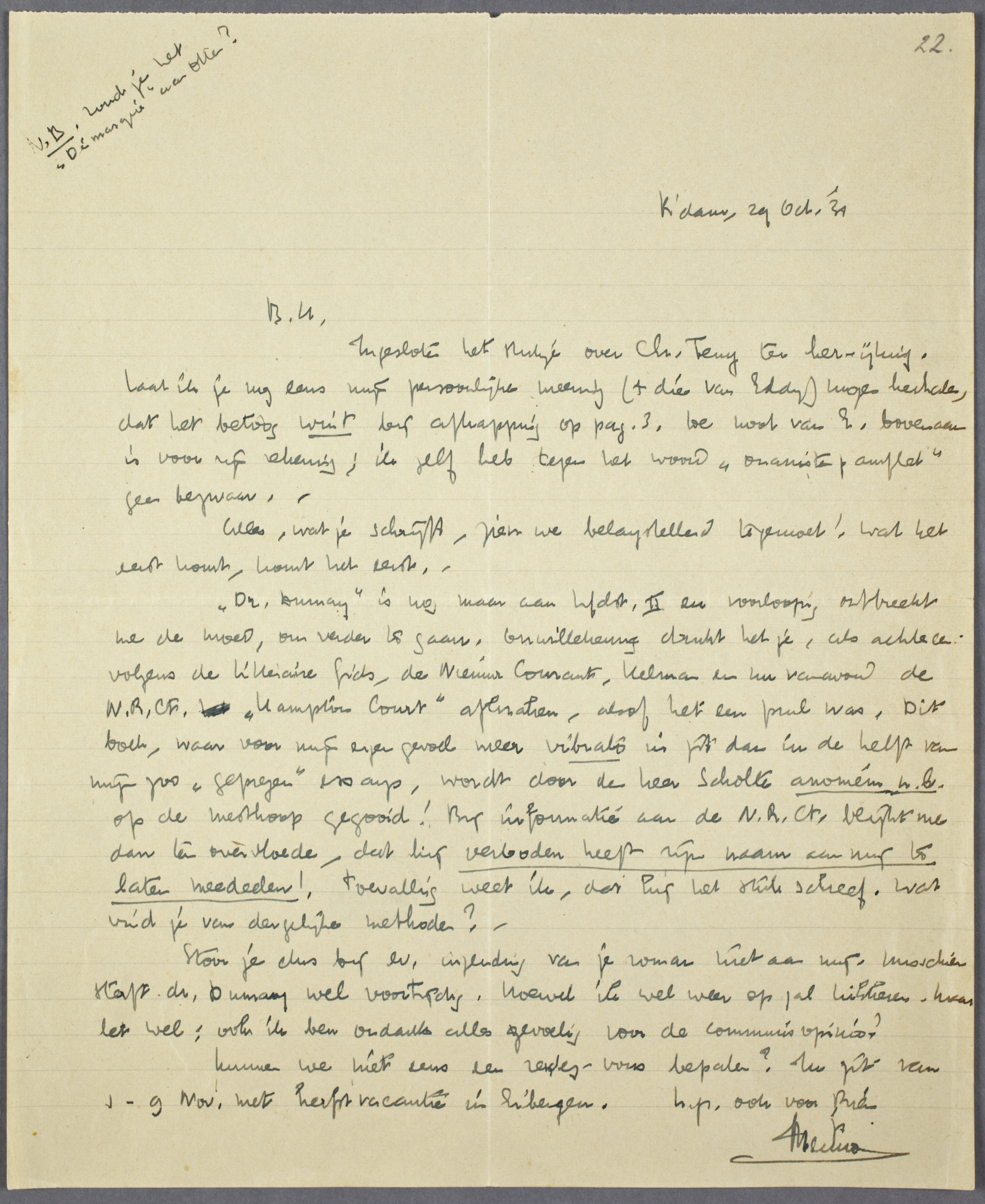 ‘Dr. Dumay’ is nog maar aan hfdst. II en voorloopig ontbreekt me de moed, om verder te gaan. Onwillekeurig drukt het je, als achtereenvolgens de litteraire Gids, de Nieuwe Courant, Helman en nu vanavond de N.R.C. ‘Hampton Court’ afmaken, alsof het een prul was. Dit boek, waar voor mijn eigen gevoel meer vibrato in zit dan in de helft van mijn zoo ‘geprezen’ essays, wordt door de heer Scholte anoniem n.b. op de mesthoop gegooid! Bij informatie aan de N.R.C. blijkt me dan ten overvloede, dat hij verboden heeft zijn naam aan mij te laten meedeelen! Toevallig weet ik, dat hij het stuk schreef. Wat vind je van dergelijke methoden? -