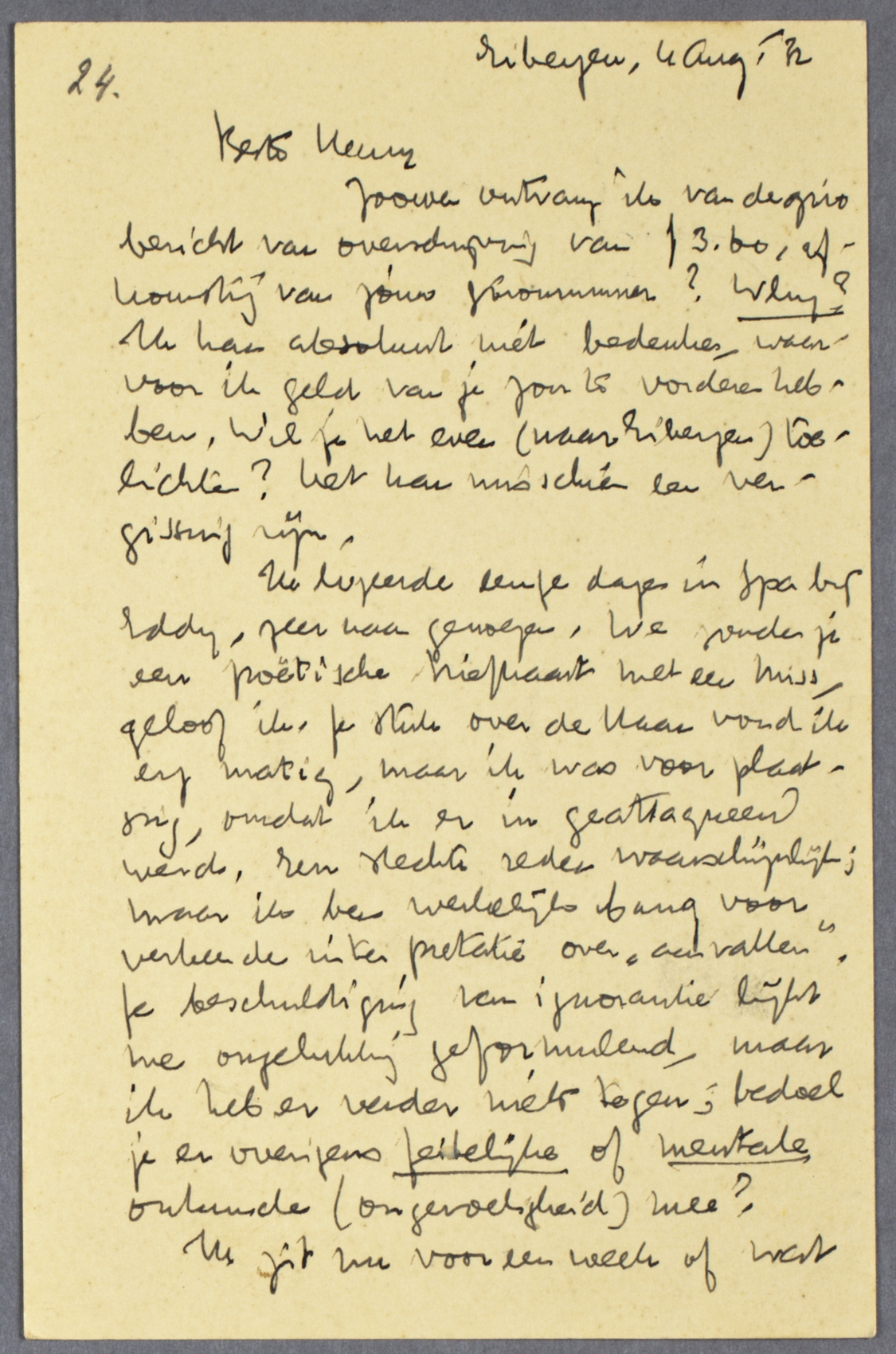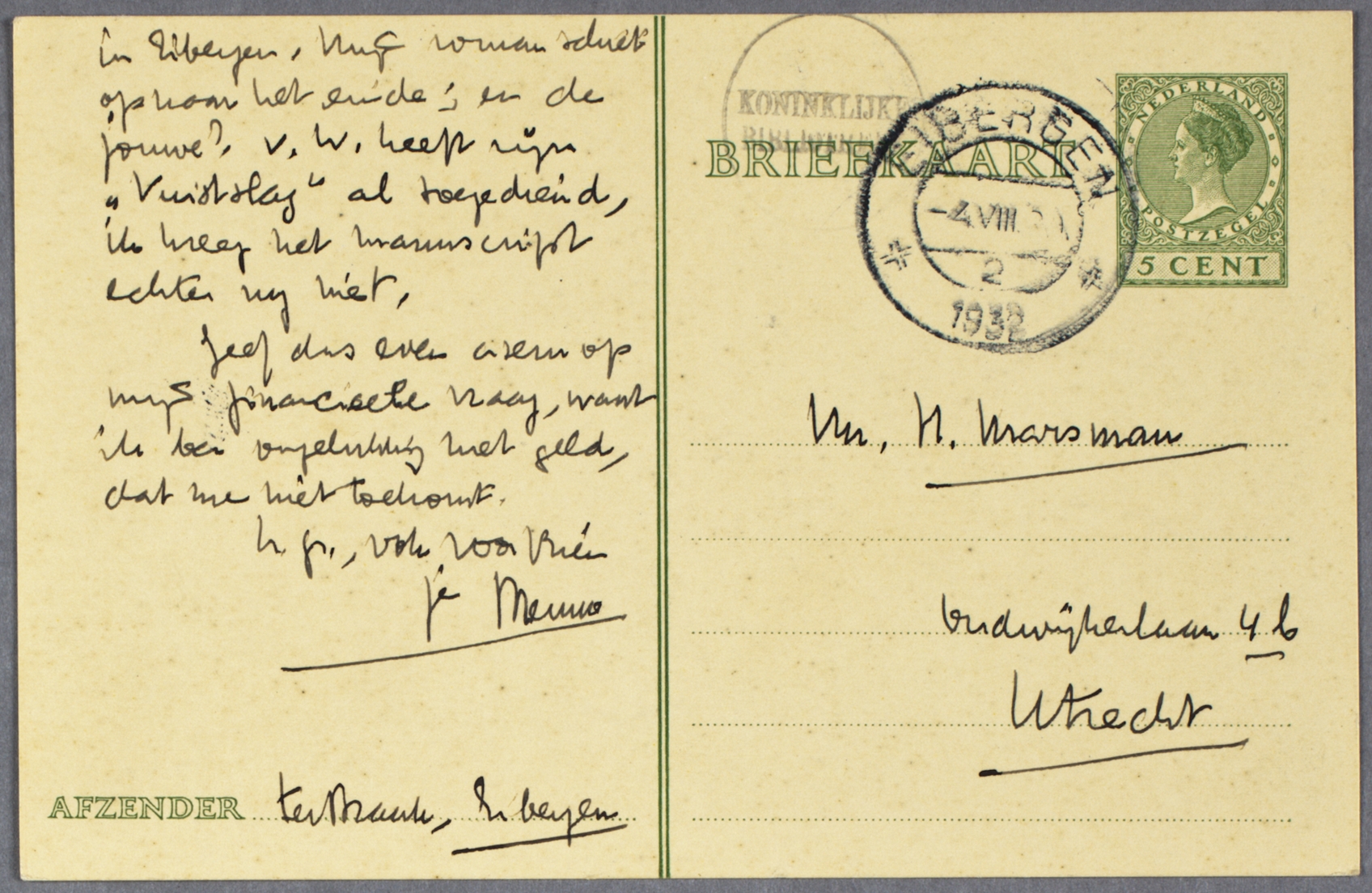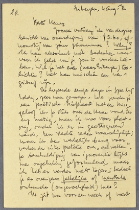 Ik logeerde eenige dagen in Spa bij Eddy, zeer naar genoegen. We zonden je een poëtische briefkaart met een miss, geloof ik. Je stuk over de Haan vond ik erg matig, maar ik was voor plaatsing, omdat ik er in geattaqueerd werd. Een slechte reden waarschijnlijk; maar ik ben werkelijk bang voor verkeerde interpretatie over ‘aanvallen’. Je beschuldiging van ignorantie lijkt me ongelukkig geformuleerd, maar ik heb er verder niets tegen; bedoel je er overigens feitelijke of mentale onkunde (ongevoeligheid) mee?