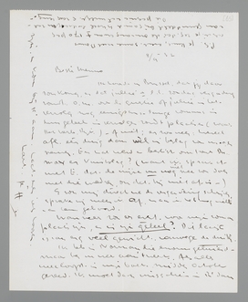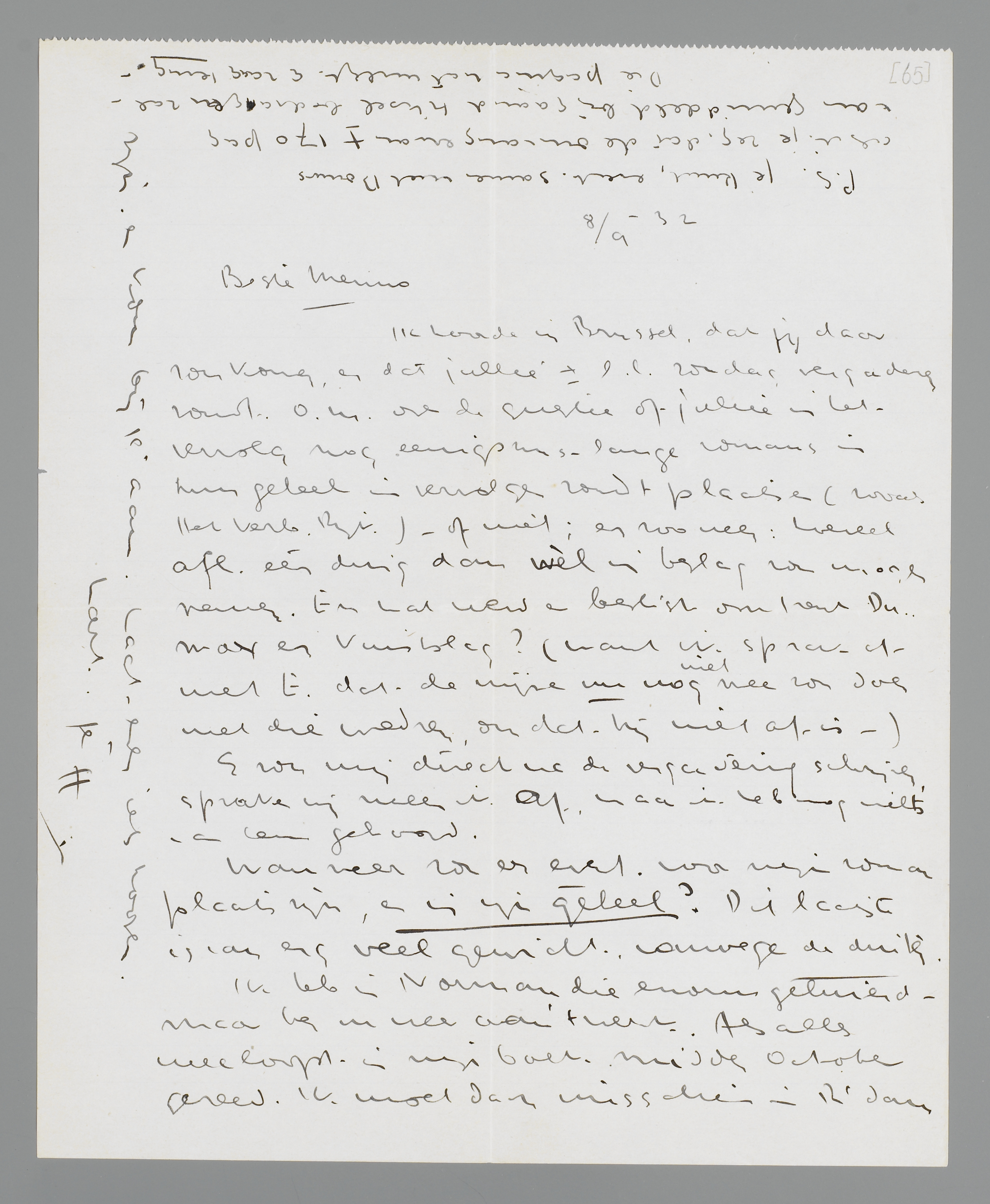 Ik hoorde in Brussel, dat jij daar zou komen en dat jullie ± j.l. Zondag vergaderen zoudt o.m. over de questie of jullie in het vervolg nog eenigszins-lange romans in hun geheel in vervolgen zoudt plaatsen (zooals Het Verb. Rijk) - of niet; en zoo neen: hoeveel afl. éen ding dan wèl in beslag zou mogen nemen. En wat werd er beslist omtrent Dumay en Vuistslag? (want ik sprak af met E. dat de mijne nu nog niet mee zou doen met die wedren, omdat hij niet af is-)