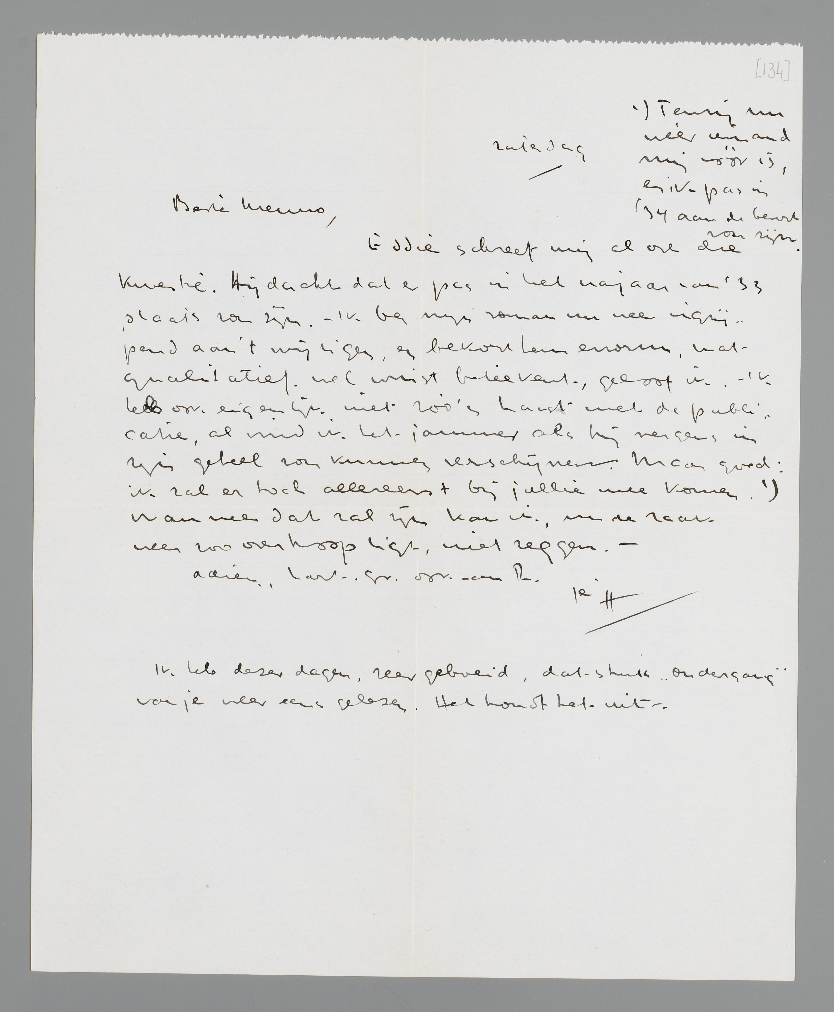 Eddie schreef mij al over die kwestie. Hij dacht dat er pas in het najaar van '33 plaats zou zijn. - ik ben mijn roman nu zeer ingrijpend aan 't wijzigen, en bekort hem enorm, wat qualitatief wel winst oplevert, geloof ik. - Ik heb ook eigenlijk niet zoo'n haast met de publicatie, al vind ik het jammer als hij nergens in z'n geheel zou kunen verschijnen. Maar goed: ik zal er toch allereerst bij jullie mee komen.* Wanneer dat zal zijn kan ik, nu de zaak weer zoo overhoop ligt, niet zeggen.