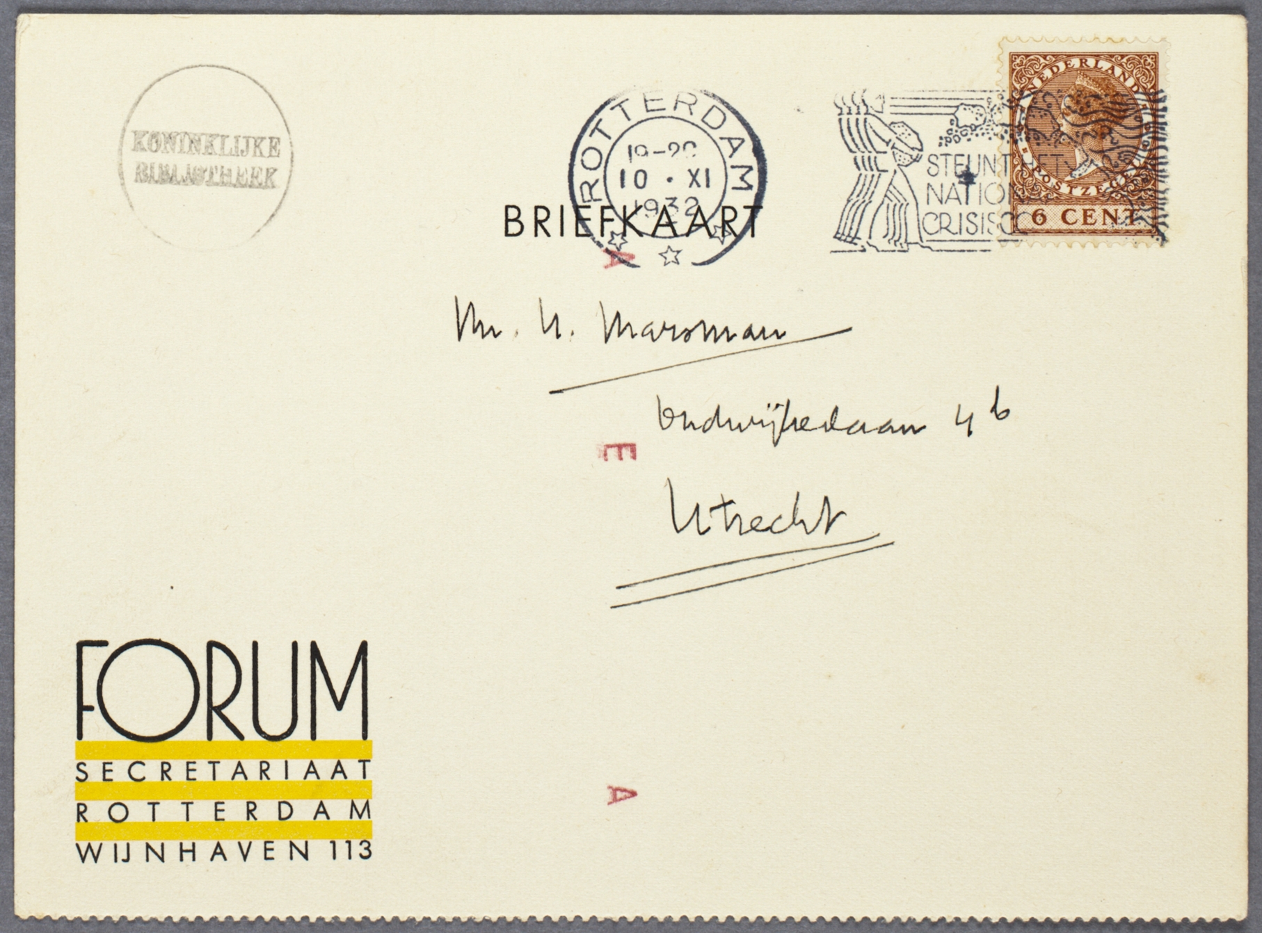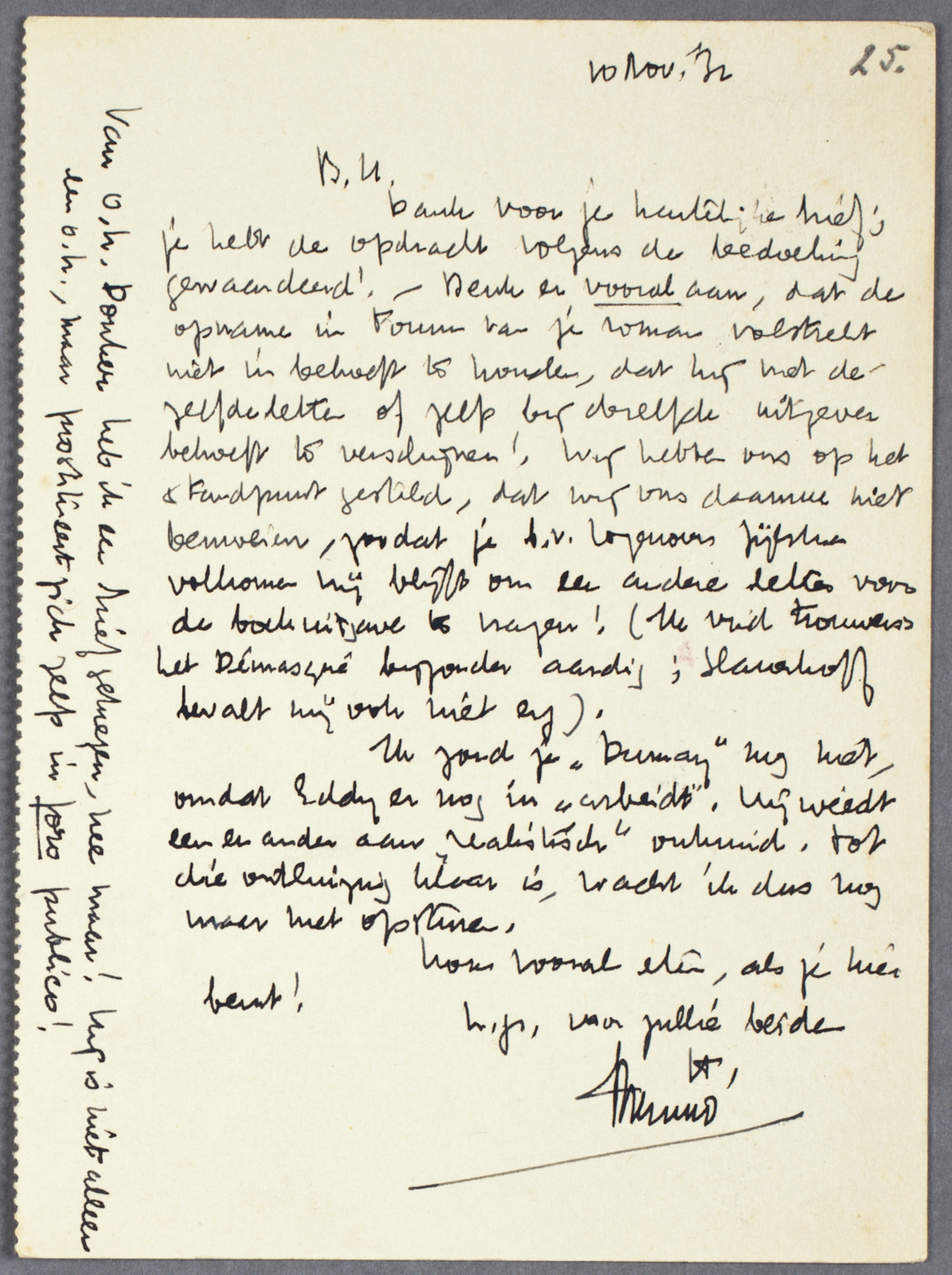 Dank je voor je hartelijke brief; je hebt de opdracht volgens de bedoeling gewaardeerd! - Denk er vooral aan, dat de opname in Forum van je roman volstrekt niet hoeft in te houden, dat hij met dezelfde letter of zelfs bij dezelfde uitgever behoeft te verschijnen! Wij hebben ons op het standpunt gesteld, dat wij ons daarmee niet bemoeien, zoodat je b.v. tegenover Zijlstra volkomen vrij blijft om een andere letter voor de boekuitgave te vragen! (Ik vind trouwens het Démasqué bijzonder aardig; Slauerhoff bevalt mij ook niet erg).
